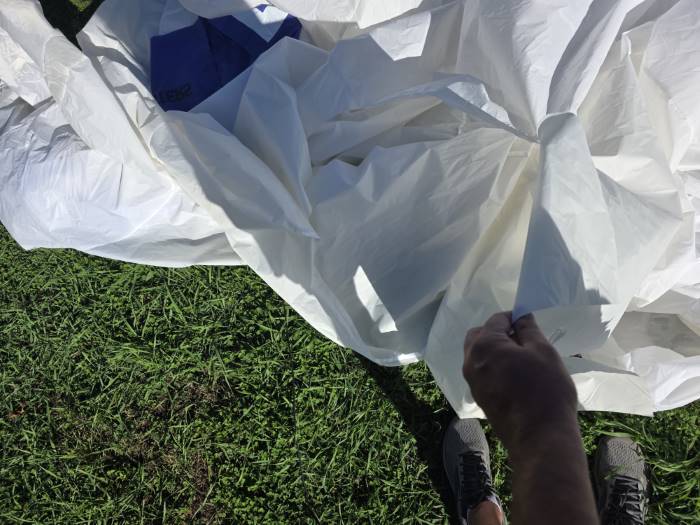 - Tie tether cords to grommets on decoration and then to ground stakes to hold Stay Puft in place