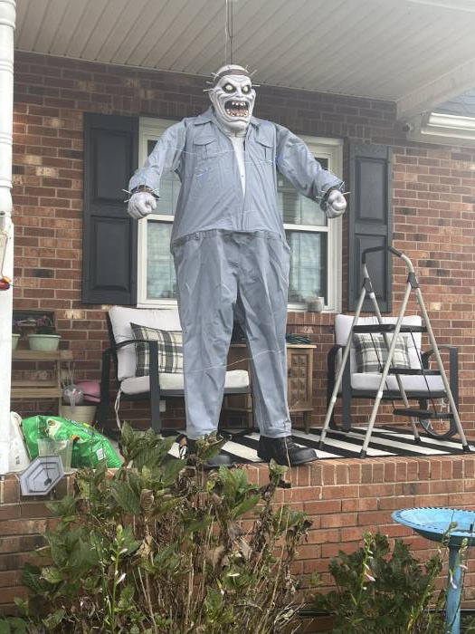 Measuring nearly 7 feet tall (yep, really), this animatronic ghostly brute is made with plastic and polyester fabric clothing that replicates Nunzio’s grimy postmortem prison jumpsuit. His eyes light up in a spooky yellow glow—just the right shade of eerie—and he emits haunting sounds ripped right from the film’s courtroom chaos.