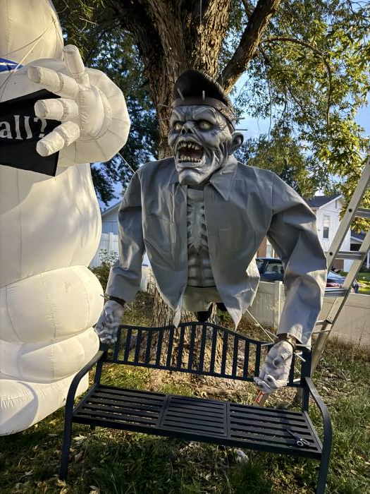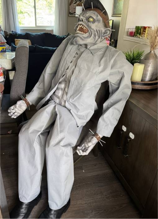 I didn’t realize until I tried to put it together that this is a hanging decoration. It does not stand alone by itself. It’s also not a true animatronic. It doesn’t move, but has a recording that goes off with a sensor.
