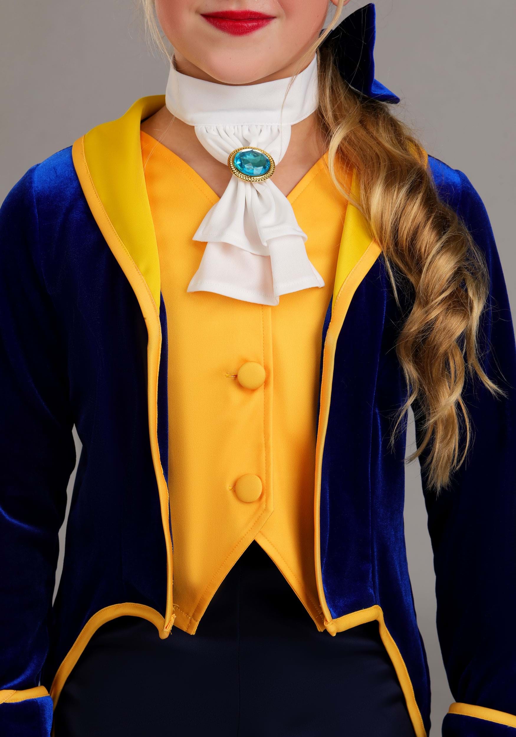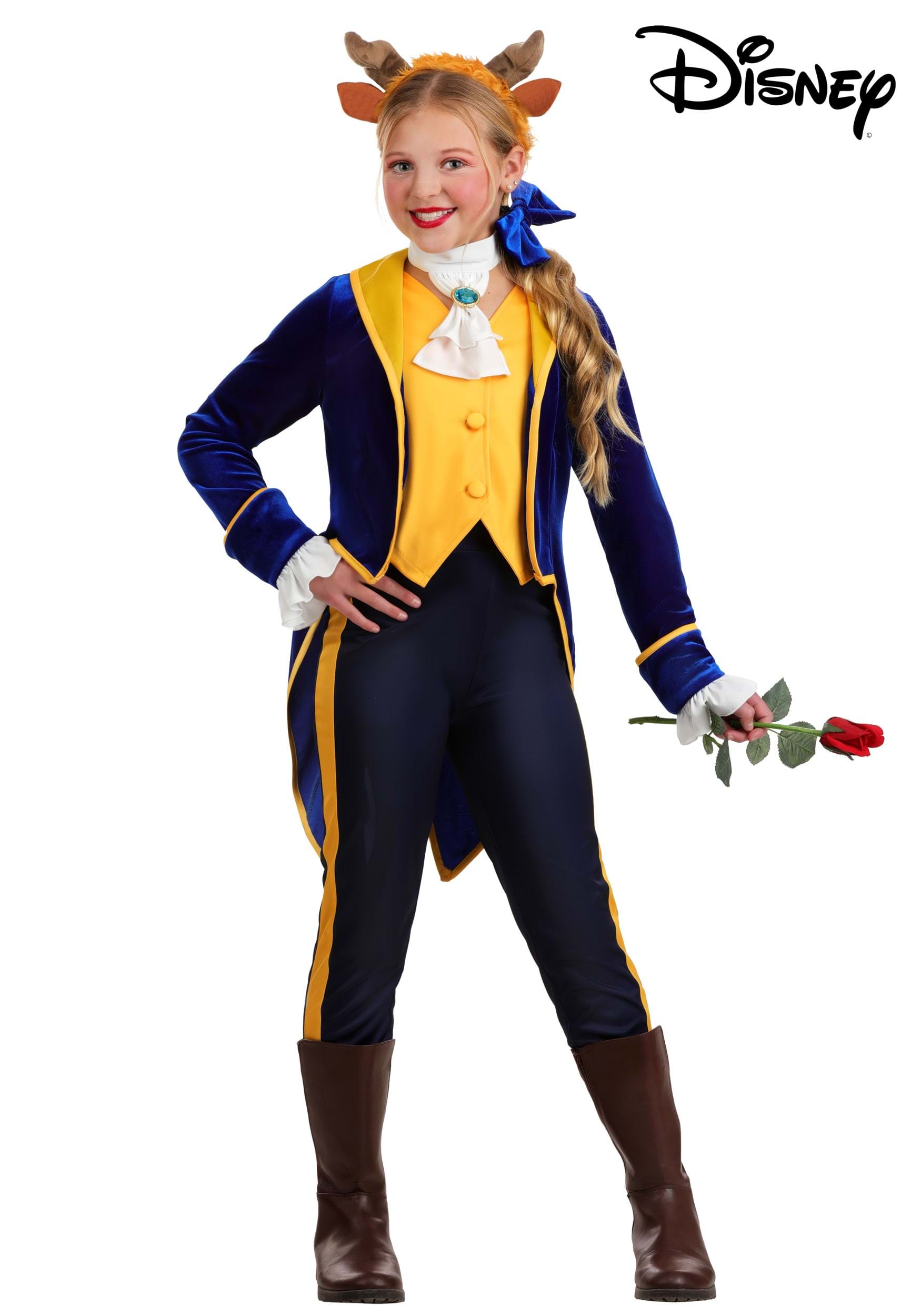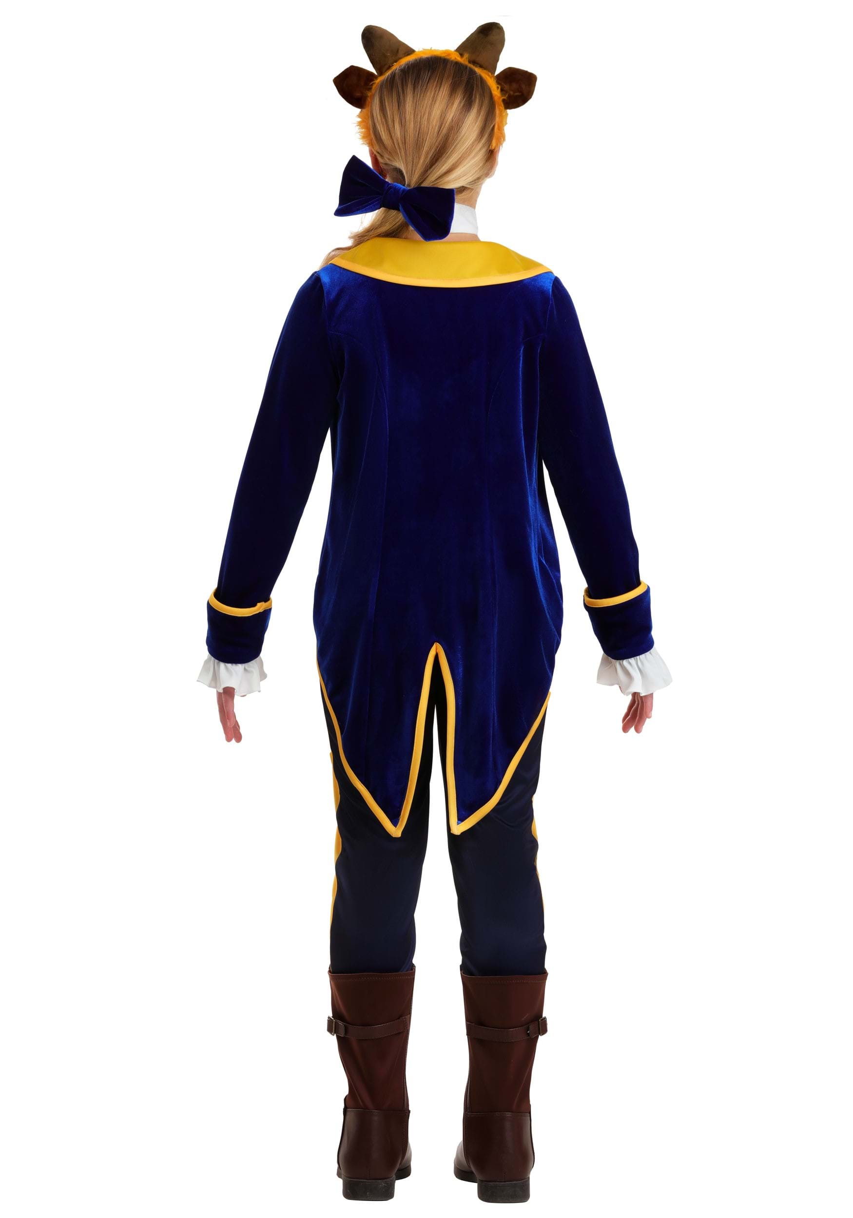 Dressing like the Beast starts with tapered, elastic waistband pants. A vest with front buttons and a hook-and-loop fastened jabot featuring a faux gem brooch layer on next. Then, a cropped velvet jacket with long tails and golden yellow accents completes the formal look. Perfect the costumes polished look with the included horns and ears headband and blue velvet hairbow.