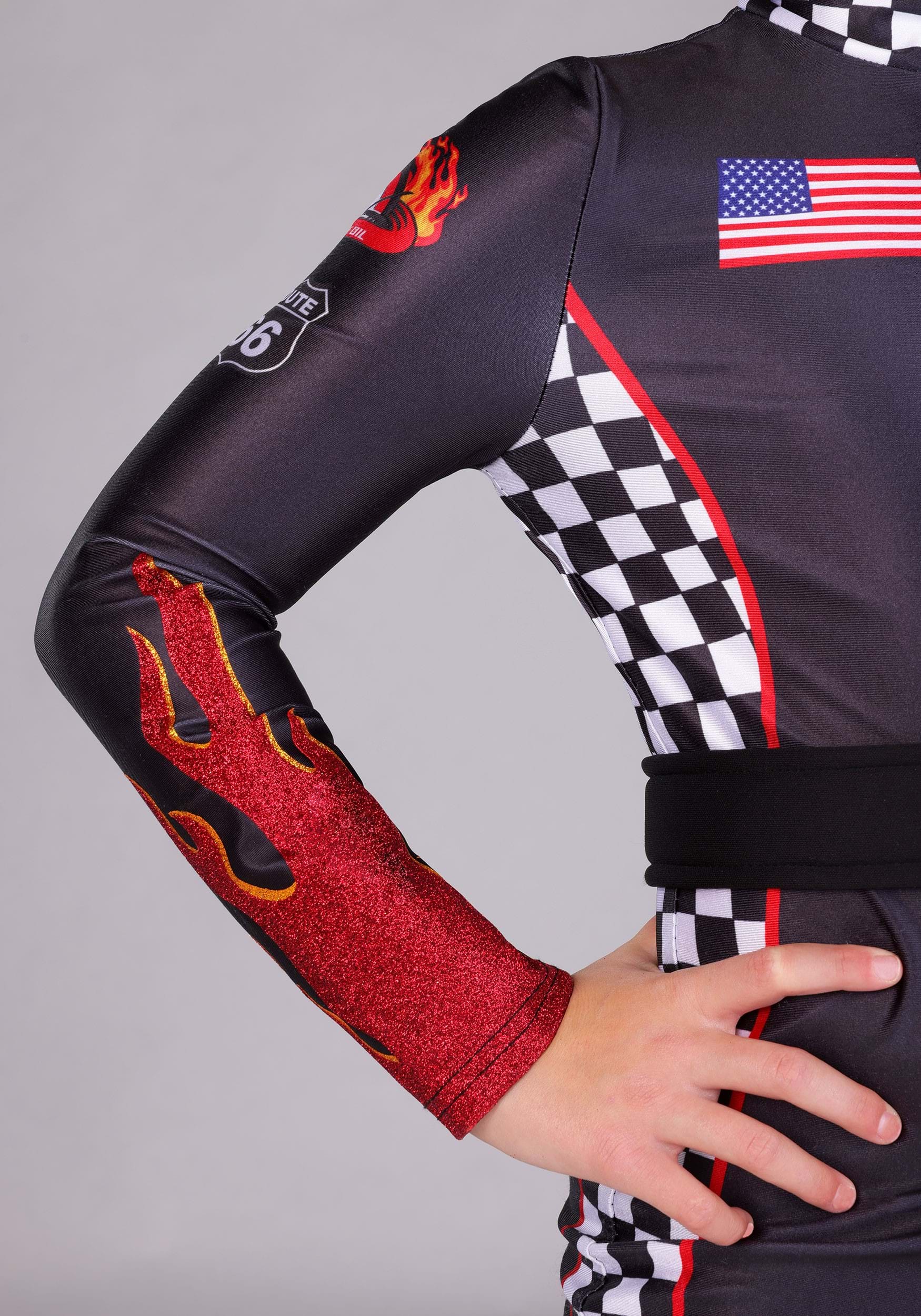 This is an exclusive Girl's Fiery Race Car Driver Costume.