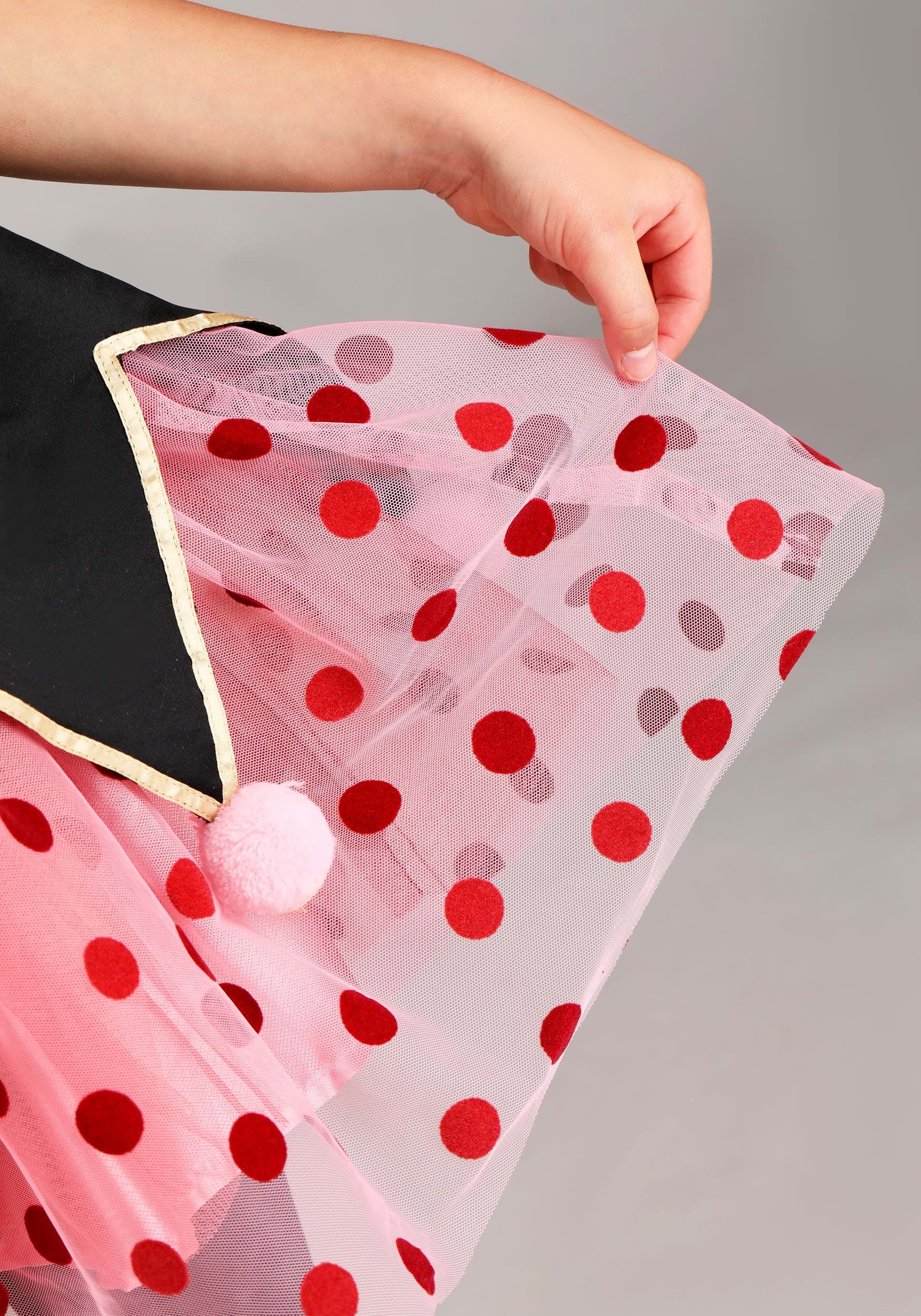 This Made By Us kids costume has a zippered dress, hat, tie-on collar, and tights. The dress has a black satin bodice with pale-gold trim and pink pompoms. Black-and-white striped satin is used for puff sleeves and a peplum over a skirt layer trimmed with ribbon and pompoms. The main skirt is made from polka-dot tulle and a satin lining for comfort.