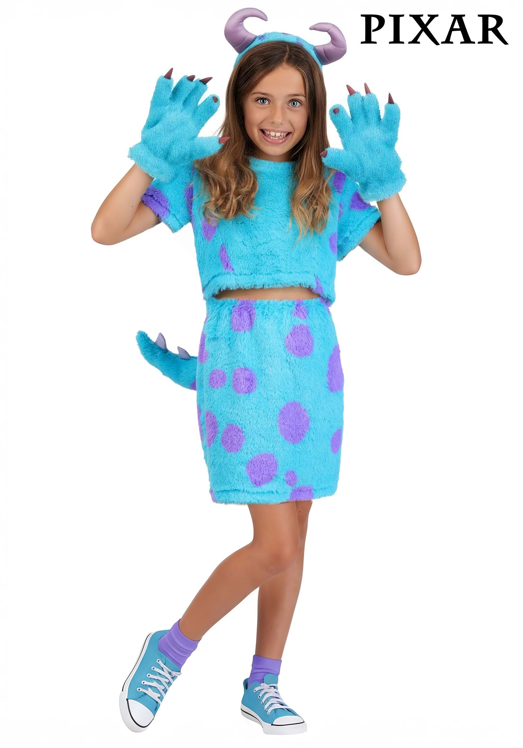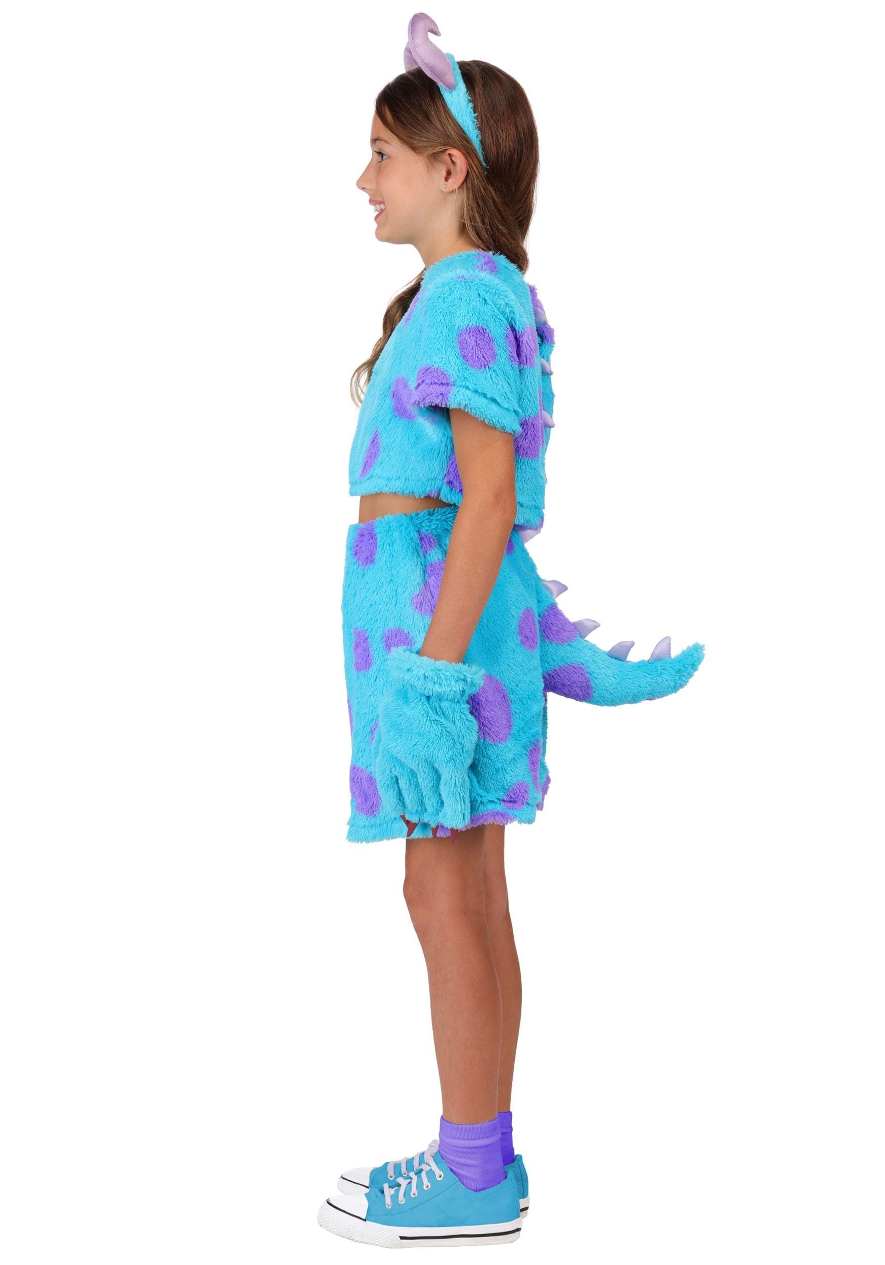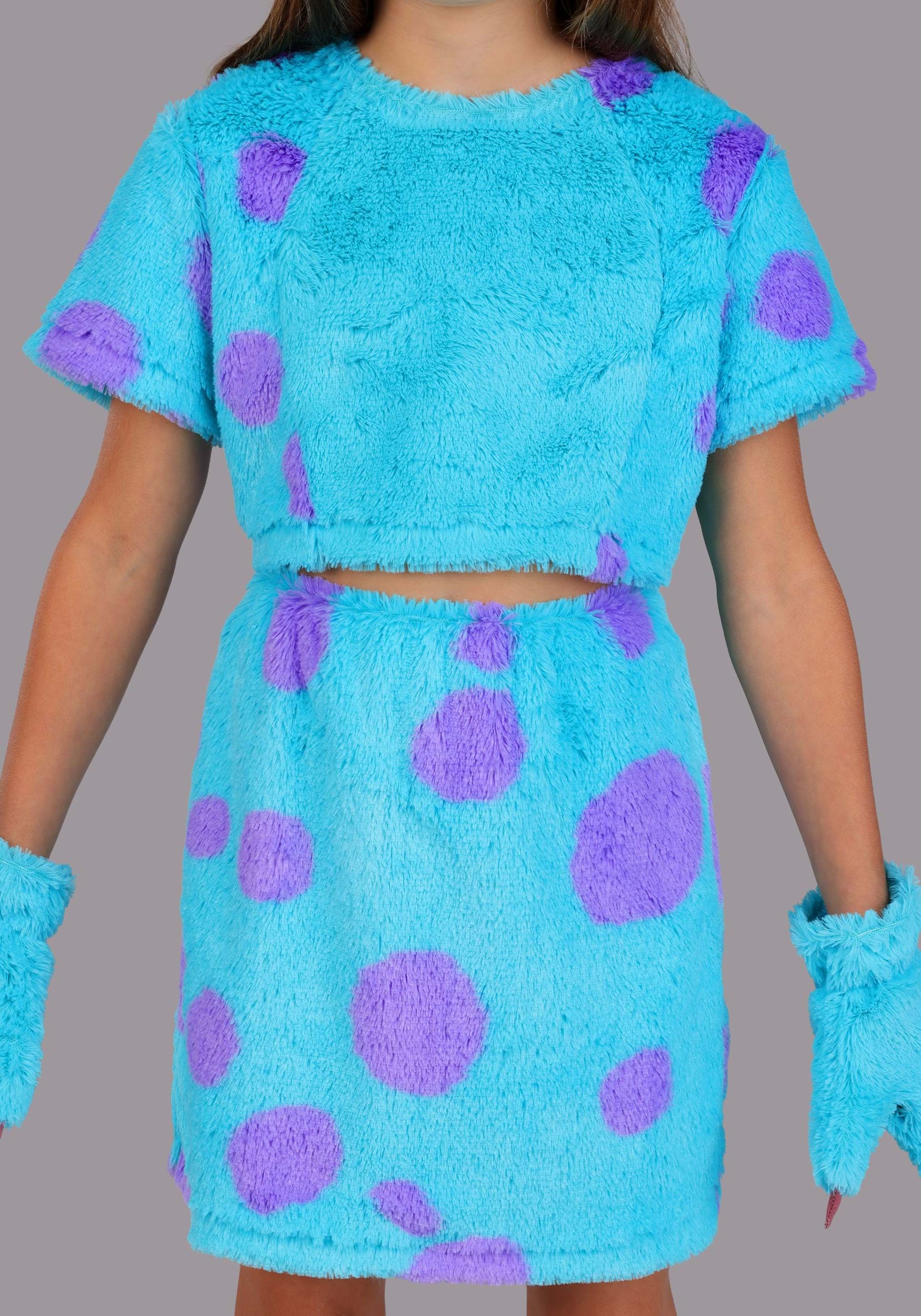 The soft faux fur top stretches with ease and is sprinkled with Sulley's signature purple spots, plus shiny satin spikes down the back for extra monster flair. The matching skirt has a comfy elastic waistband and a plush tail. A fabric-covered headband features softly stuffed satin horns with swirling embroidery, and the fuzzy gloves finish the set with playful, padded claws. It's a sweet spin on Sulley style, full of color and character.