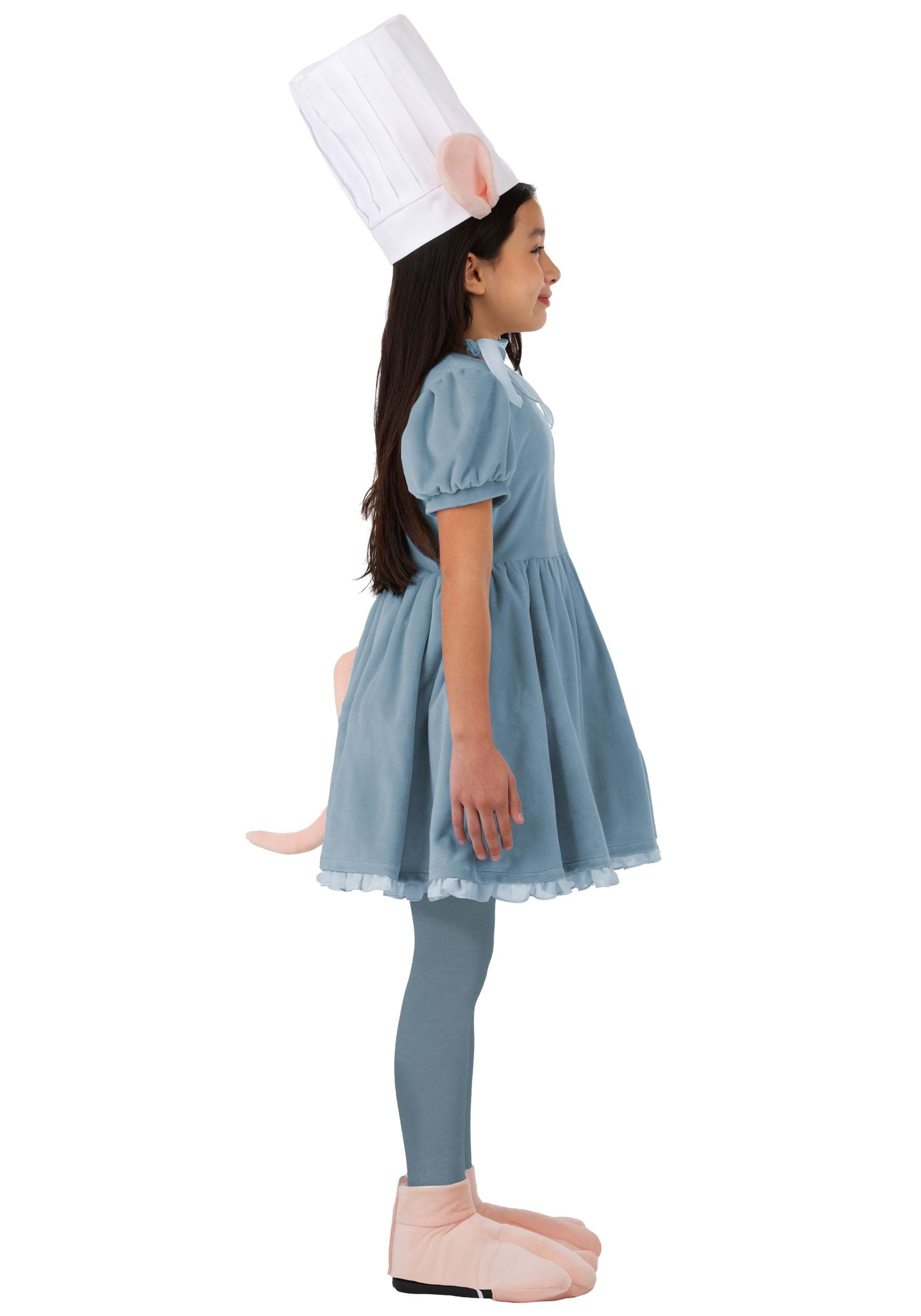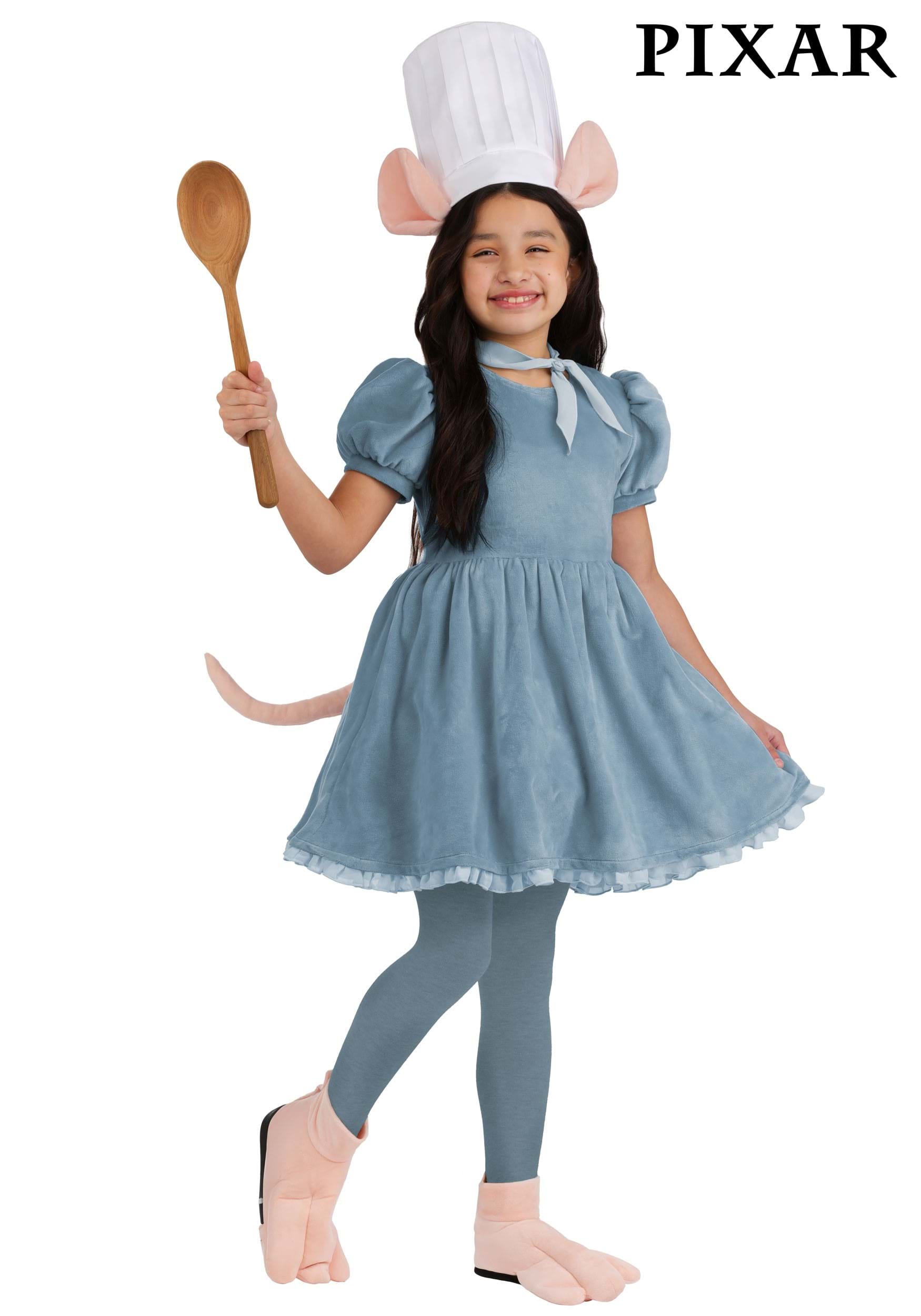 The soft Minky dress zips up the back and features a tulle underskirt for extra fluff and flair. A wire-supported tail is sewn into the back for a sculpted Remy silhouette, while a tie-on neck scarf adds a dash of Pixar polish. Matching Minky shoe covers are shaped like paws and stay in place with ankle straps and underfoot elastic. The chef's hat stands tall with foam support and plush pink ears!