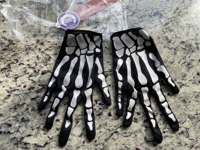 - Printed images of bones on one side of each glove