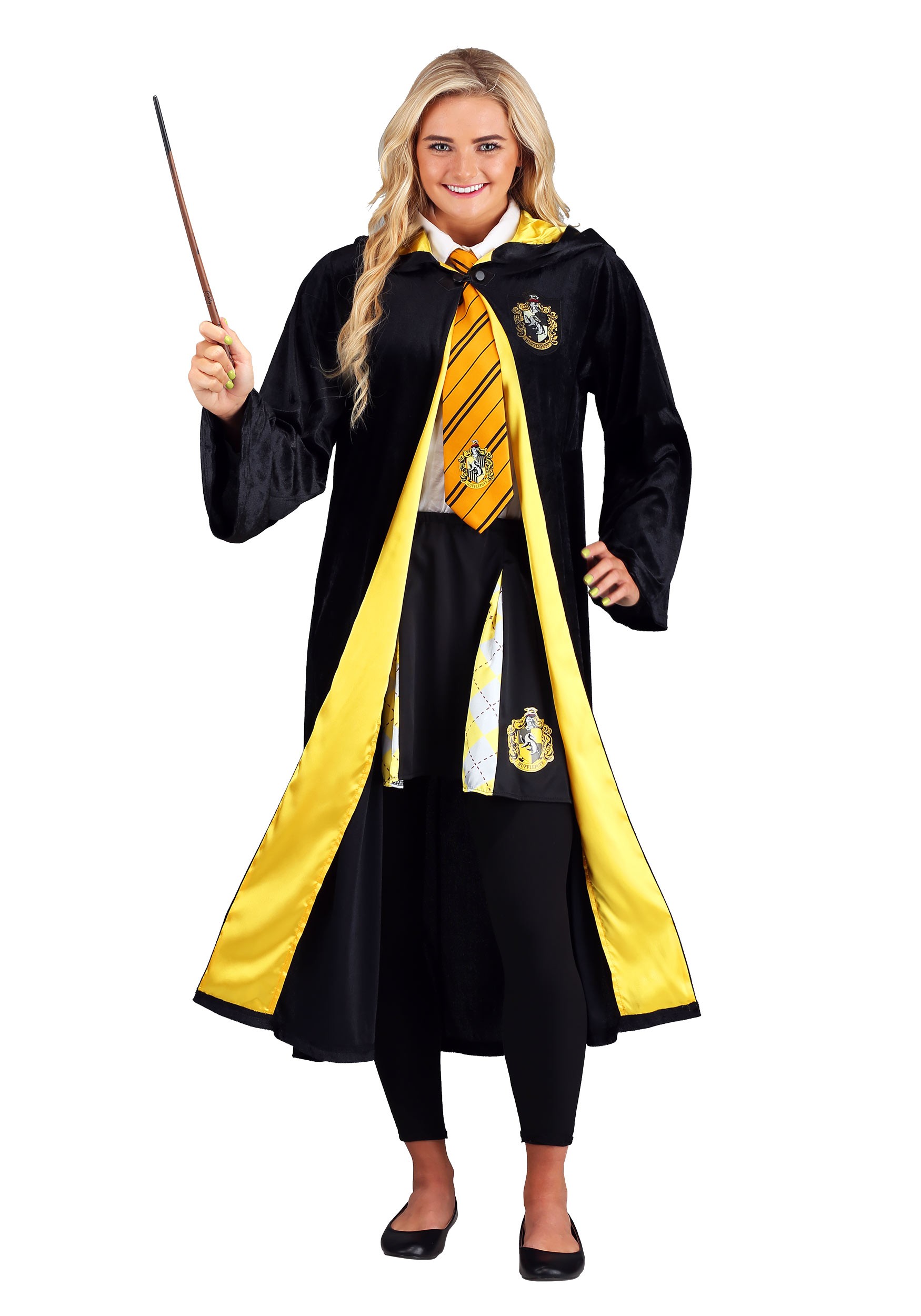 Every party needs a healer and Hufflepuffs seem destined for the work! Fortunately, we're here to help you do it in style. With this officially licensed Deluxe Hufflepuff Robe, you'll be joining up with your Hogwarts Heroes in a luxuriously long, black velour robe that fastens at your neck with a button and loop. It opens wide to show the bright yellow satin trim that matches the lining of the hood. Get your wand at the ready and let the embroidered black and yellow crest shine.