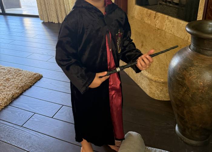 No need to rush to Madam Malkin's to get your little one ready for Hogwarts: Simply put her in this officially licensed, exclusive Harry Potter Deluxe Hermione Gryffindor Robe for Toddlers! The outfit includes a soft velour robe with an attached hood to keep her cozy warm while toddling to and from classes. A satin lining ensures a comfortable fit, and a hook and loop fastener strip in the front keeps it secure. An embroidered Gryffindor patch shows her house loyalty!