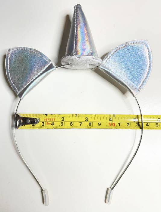 - Iridescent silver ears and stuffed conical horn attached to narrow metal headband