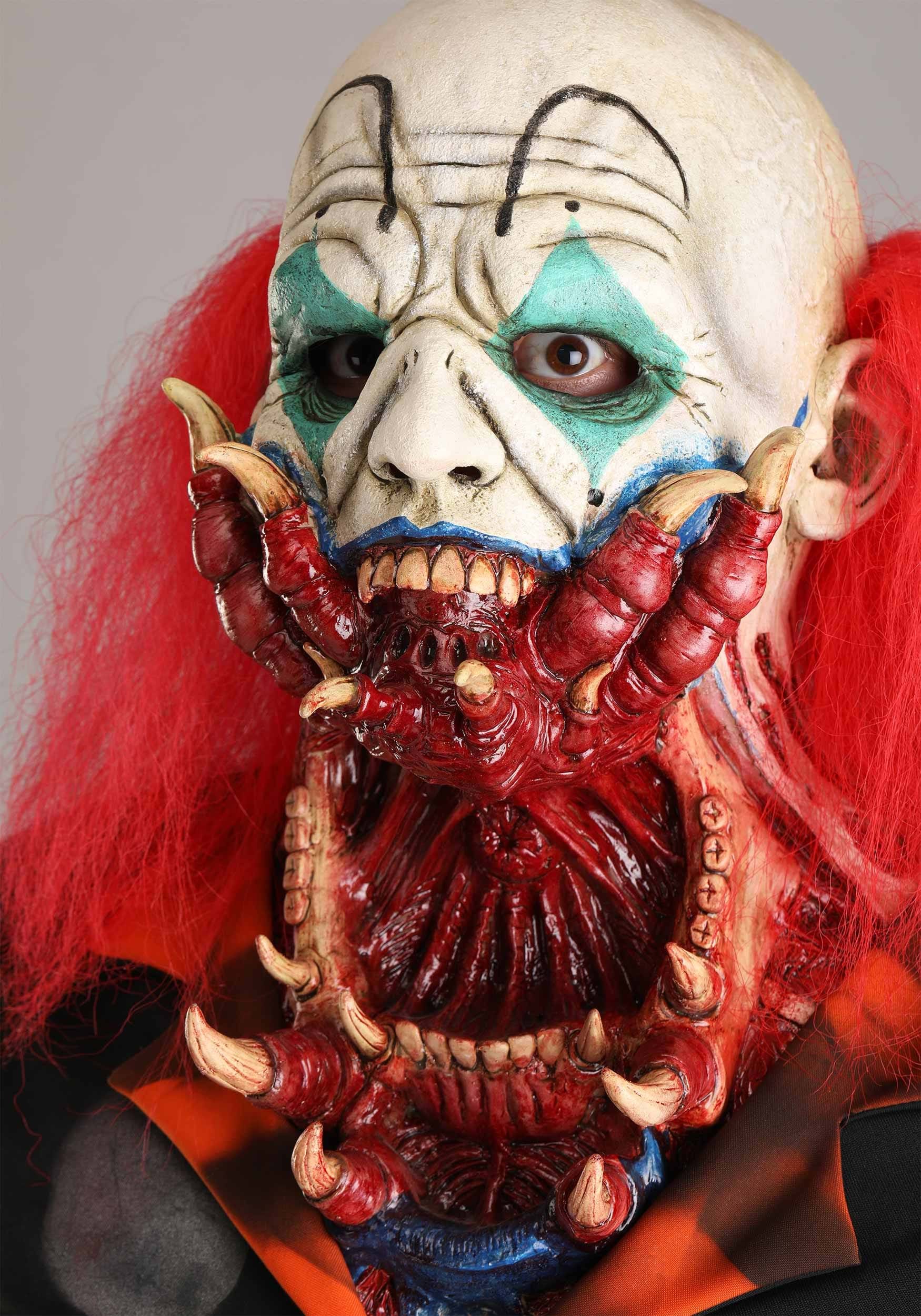 But wait, we haven't even gotten to the mask. This molded latex horror show is shaped into a clown face, but not just any clown. This is a clown with a bright red mandible jutting out of its mouth, because apparently, regular teeth just weren't enough. Oh, and let's not forget the bright red hair sticking out from the sides, like it's doing its best to keep the clown vibe alive while actively turning into a monster.