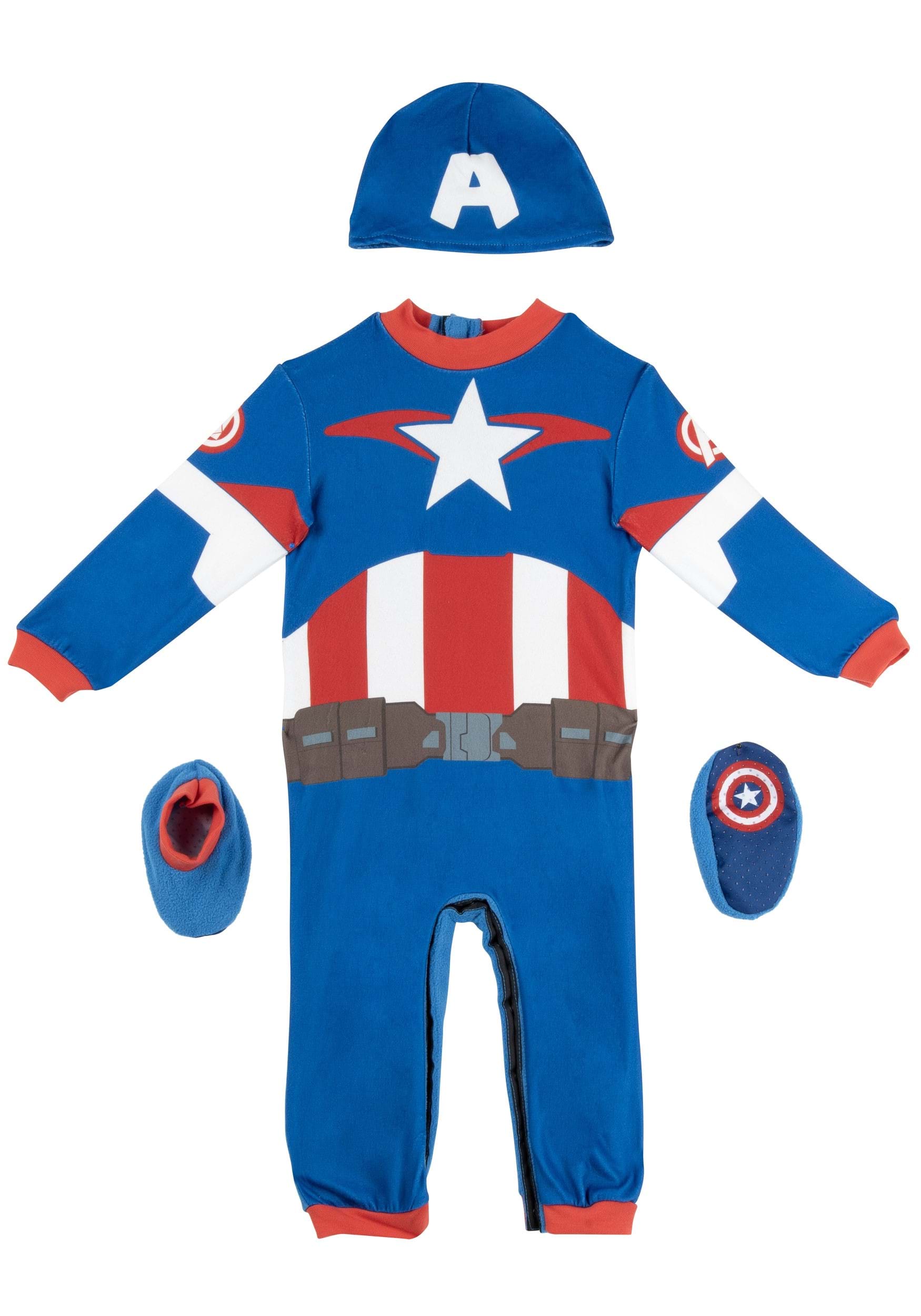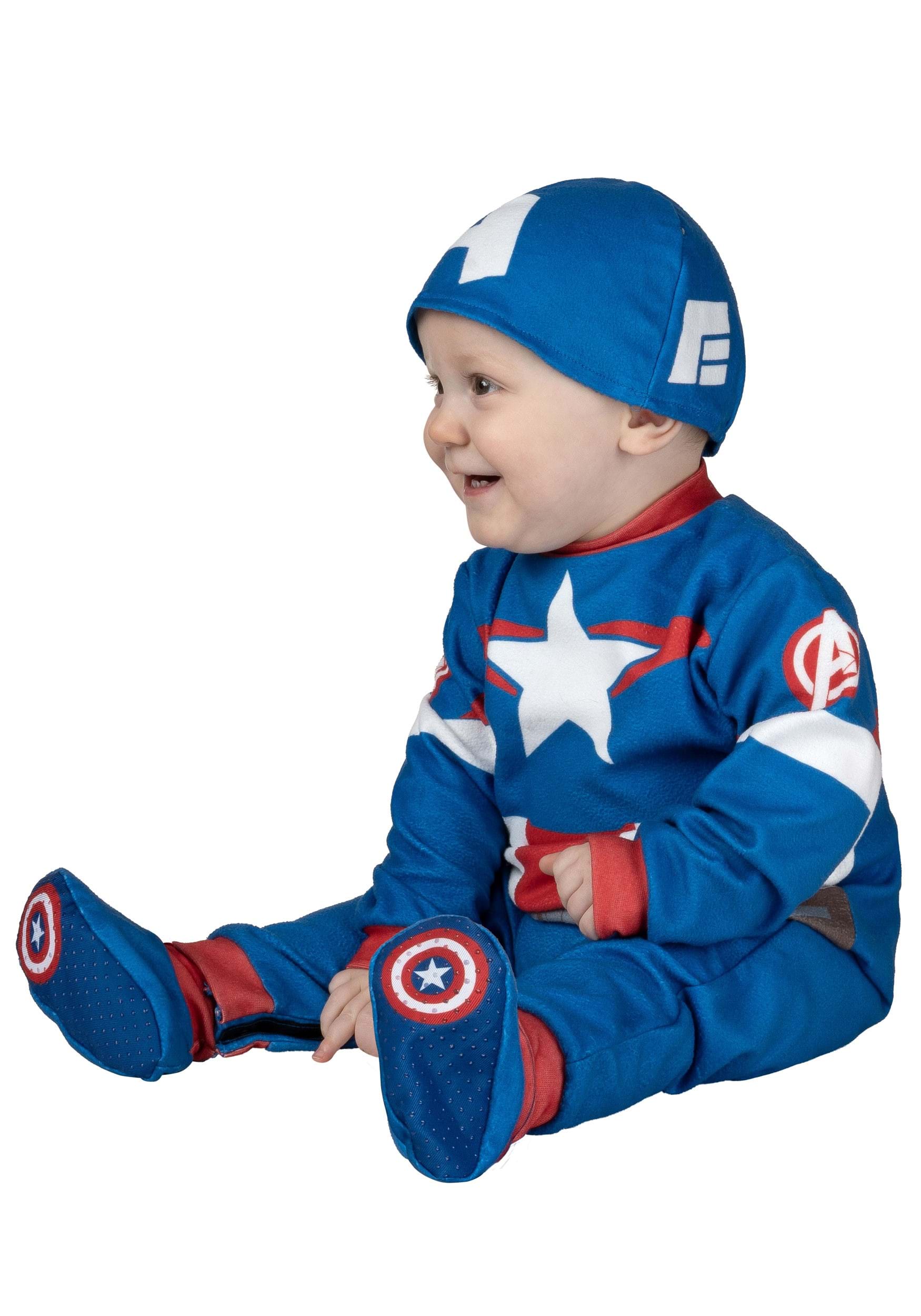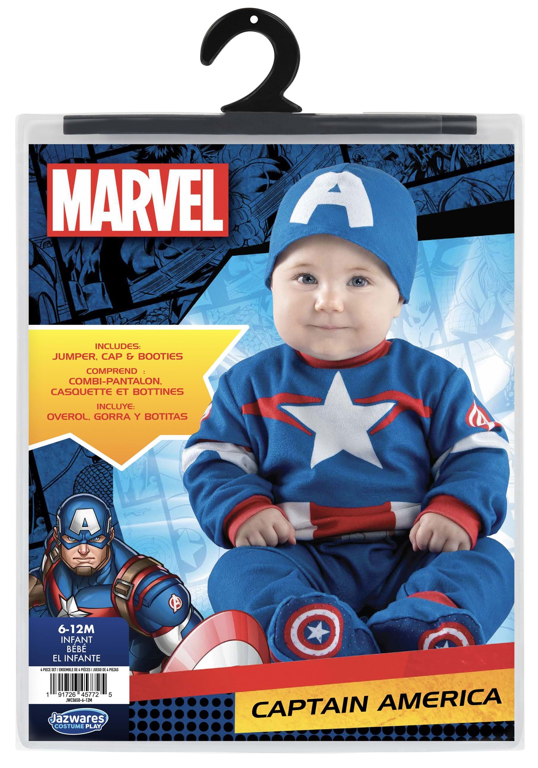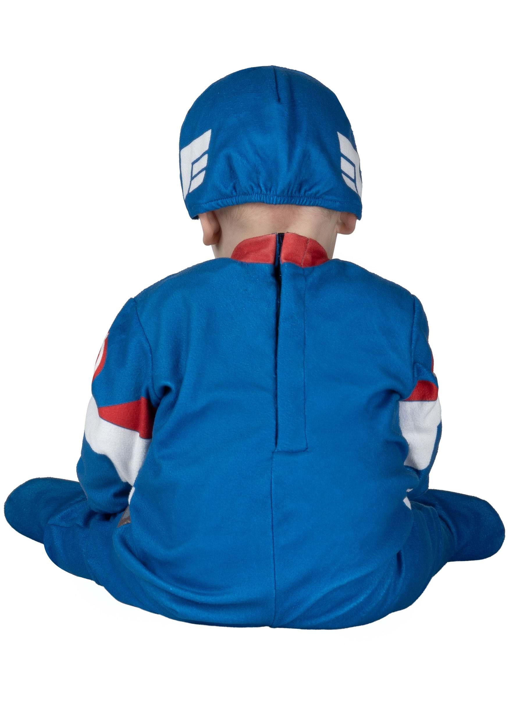 Your child can be the first and the youngest Avenger in this officially licensed Captain America Steve Rogers Costume for Infants! The soft and snuggly blue jumpsuit fastens at the back and has printed red and white graphics, including a large five-pointed star on the chest and an Avengers symbol on each sleeve. The blue booties have Captain America's famous shield printed on the soles. The blue hat is decorated with a large printed "A."