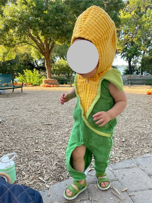 Size 12/18 MonthsThe quality of this corn costume exceeded my expectation. The corn hood has stuffing to stay full and the body of the suit is more of a corduroy with snaps up both legs and the crotch. The costume is actually armless unlike the photos online which show sleeves. I used the sized guide and ordered a 12-18 month for my 15 month old and wish I had sized up to 2T. As another review noted, the arm holes are snug and because it is a corduroy material there is NO stretch. Getting him into the costume took a little patience, and every time he squats down as toddlers do, he pops the snaps in the crotch and legs because there isn’t much room for a diaper. Otherwise, it is very adorable and well made, just needs to be a more stretchy material for babies and toddlers that wriggle around!Was this review helpful to you? - This company doesnt know babies or somethingBy Current Customer | October 13, 2025