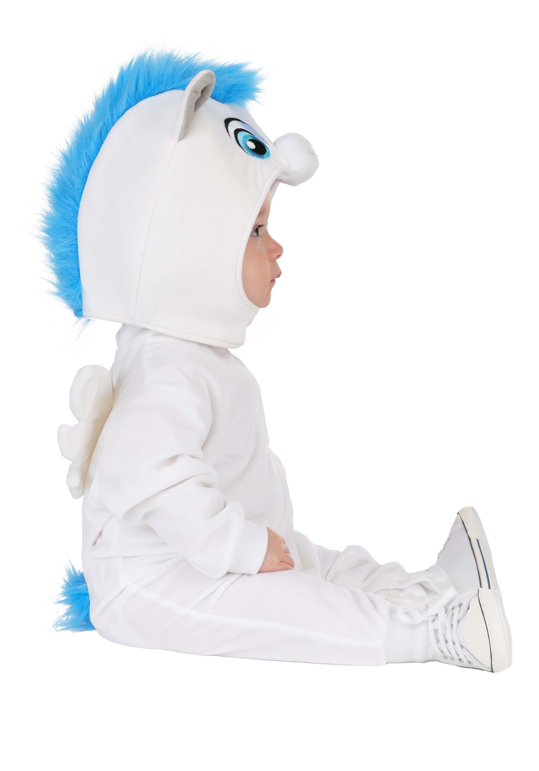 Crafted from soft white cuddle-plush fabric, the jumpsuit features a convenient front zipper and snap openings for easy changes. Rib-knit cuffs keep your infant snug, while the glittery 3D wings attach with hook-and-loop closures. The matching headpiece, complete with embroidered facial details, soft ears, and a minky mane that coordinates with the attached tail, finishes this mythic look!