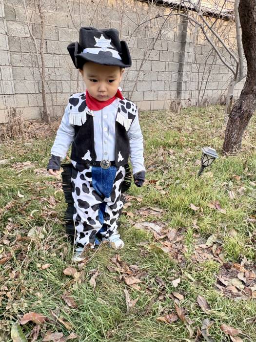 This costume set includes a jumpsuit and hat, giving your little cowpoke everything needed to hit the dusty trail—or the backyard. The jumpsuit is made from soft polyester fibers, designed with an all-over cow print that captures the classic cowboy look. It’s cleverly printed to resemble a button-up shirt paired with pants and chaps, so he looks ready to ride without needing a dozen tiny costume pieces.