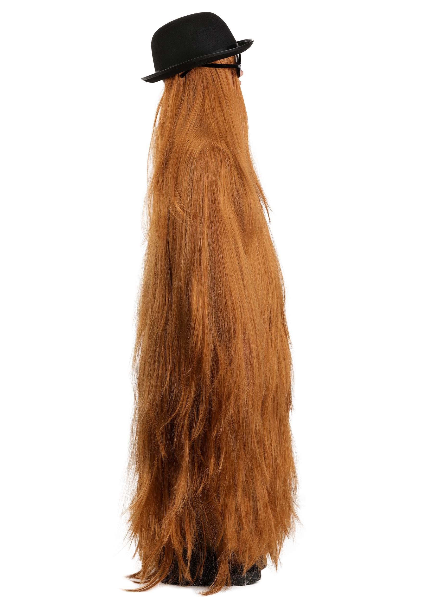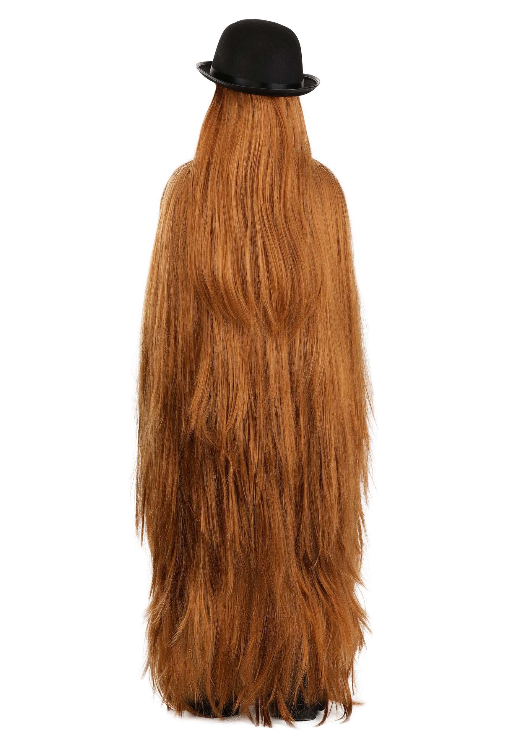 - Felt bowler hat has faux hair attached with hook and loop fasteners