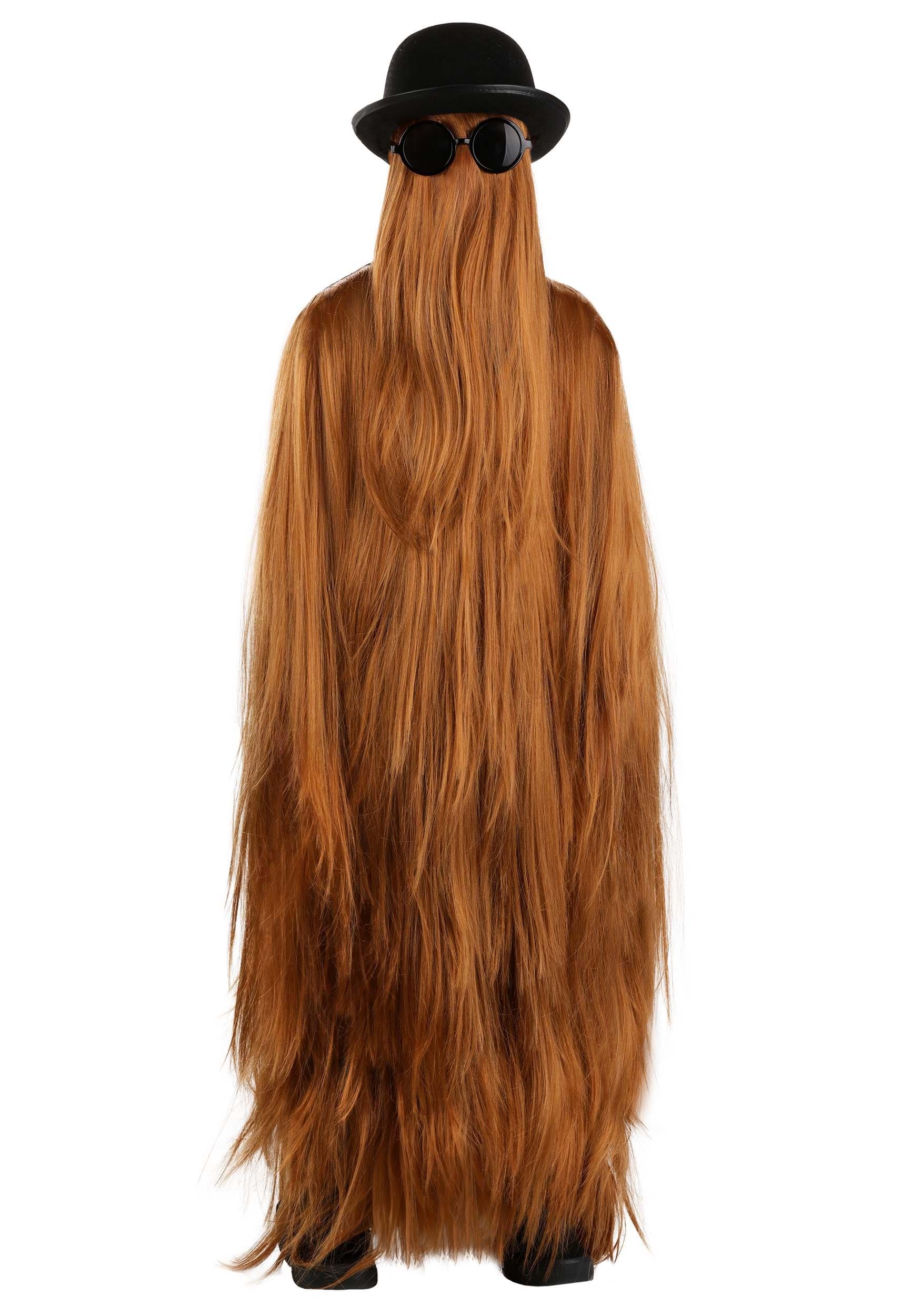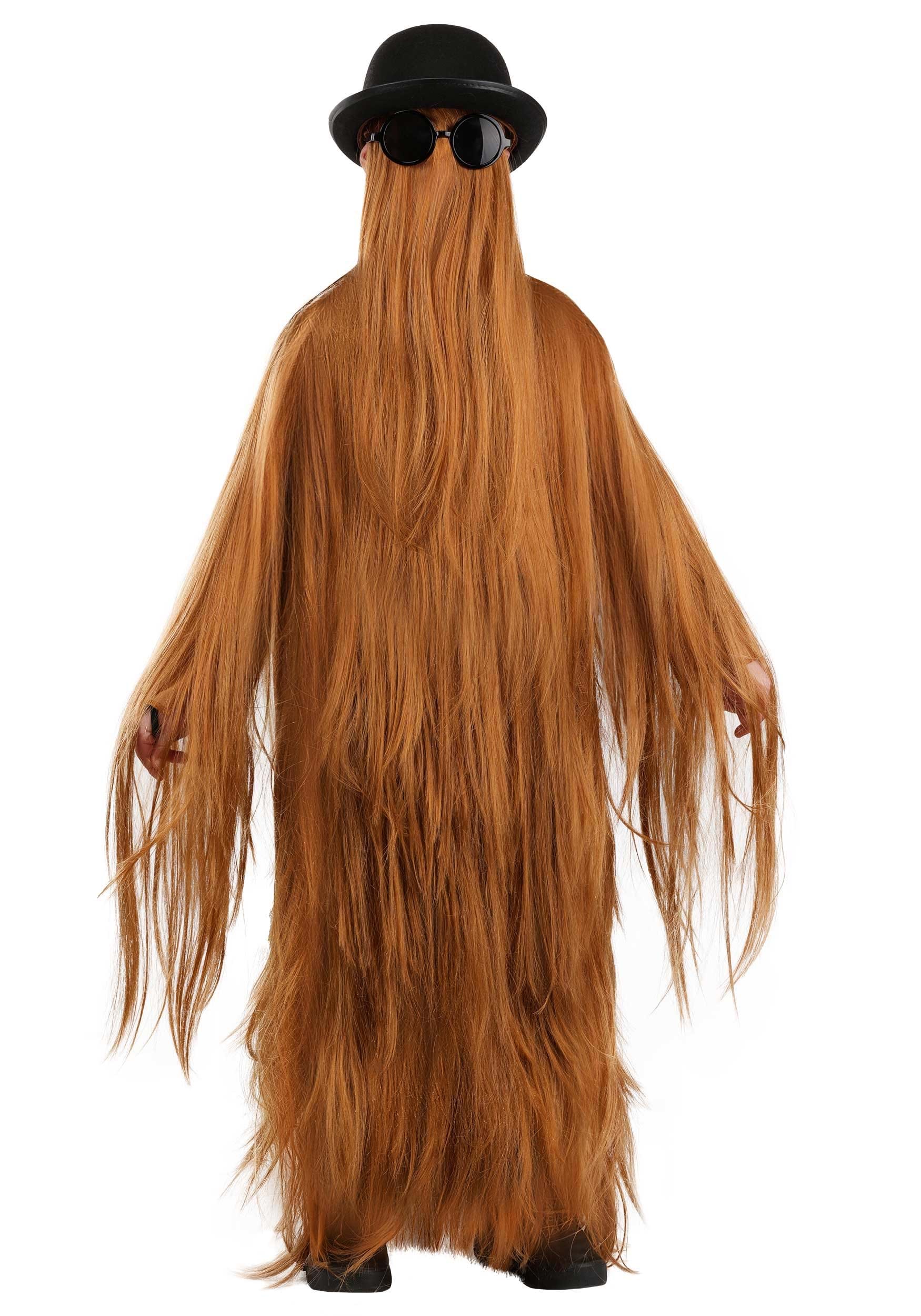 The costume includes a poly fleece tunic completely covered in long, synthetic hair-like fibers. It drapes from shoulder to toe in classic Cousin Itt fashion, allowing your child to vanish beneath a wave of shaggy fabulousness. The tunic slips on easily and creates the signature silhouette instantly—no brushing required (though good luck resisting).