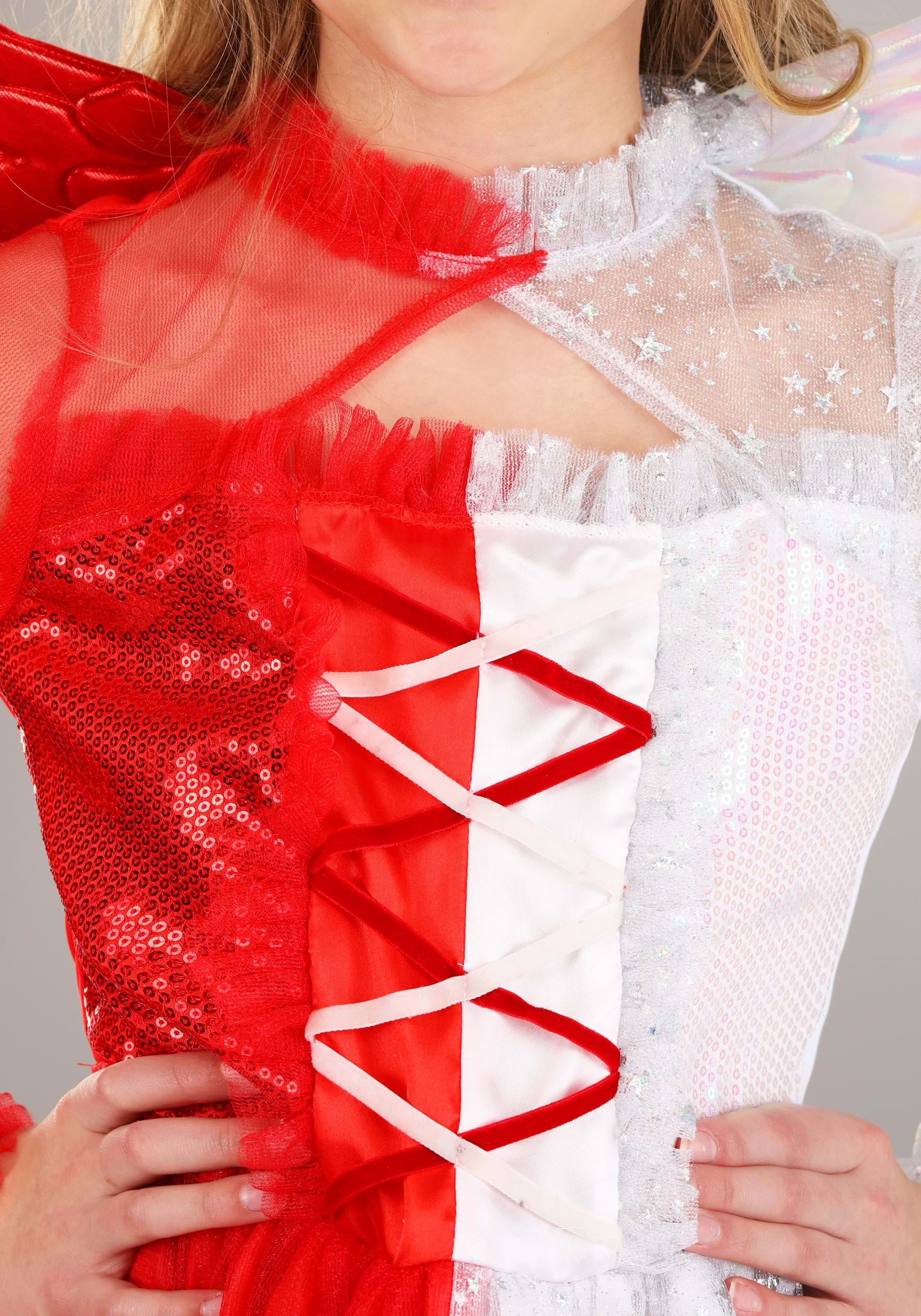 A pair of wings and a combination headband carry the split-style design into the accessories. Metallic red and holographic white material shape opposite sides of the wings. When secured by hook-and-loop fastener tape featured on the back of the dress and wings, the two-toned accessory lines up perfectly with the white and red sides of the dress.