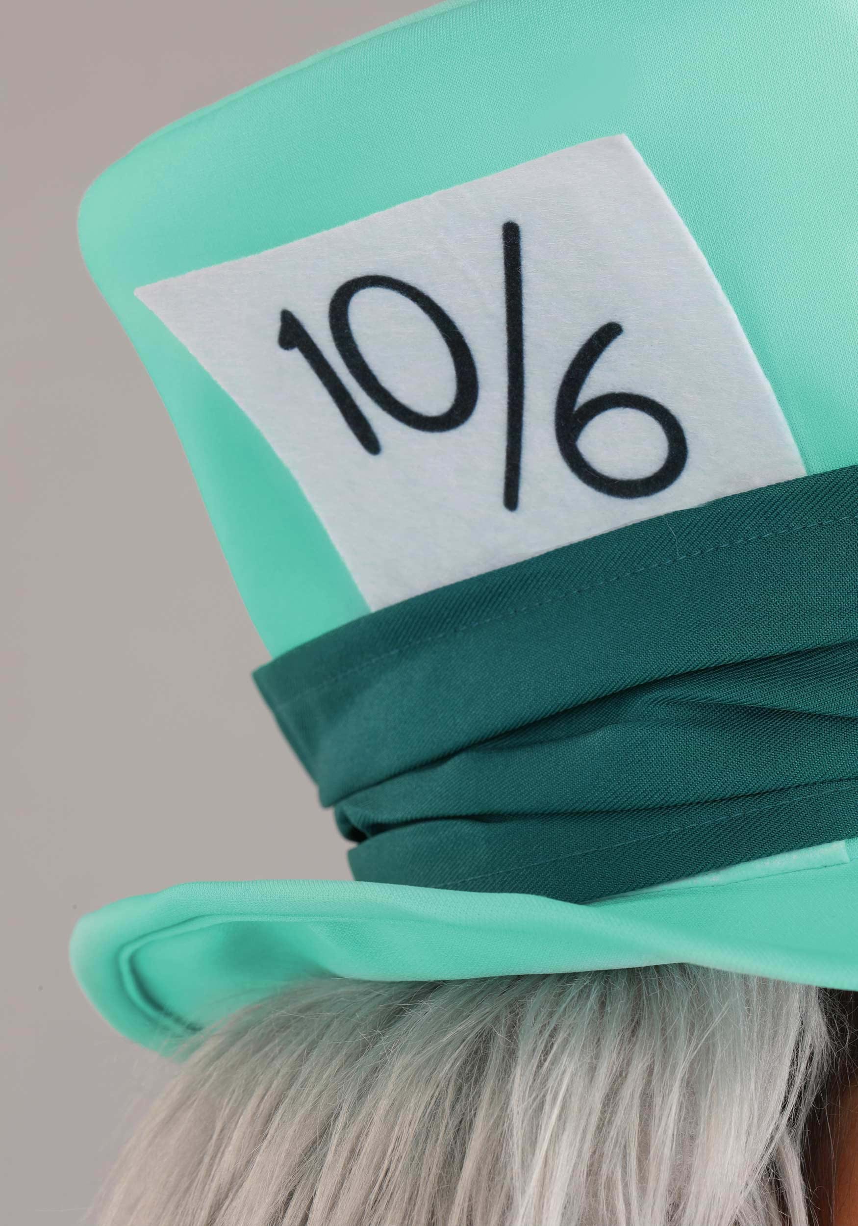 The costume starts with a jacket and vest combo. The structured jacket is made from medium-weight woven materials, while the attached vest panel with an oversized bow and appliqué buttons secures with hook-and-loop tape along the right shoulder and side. Elastic waist pants and a foam-backed hat with the Hatter's signature 10/6 card complete the look.
