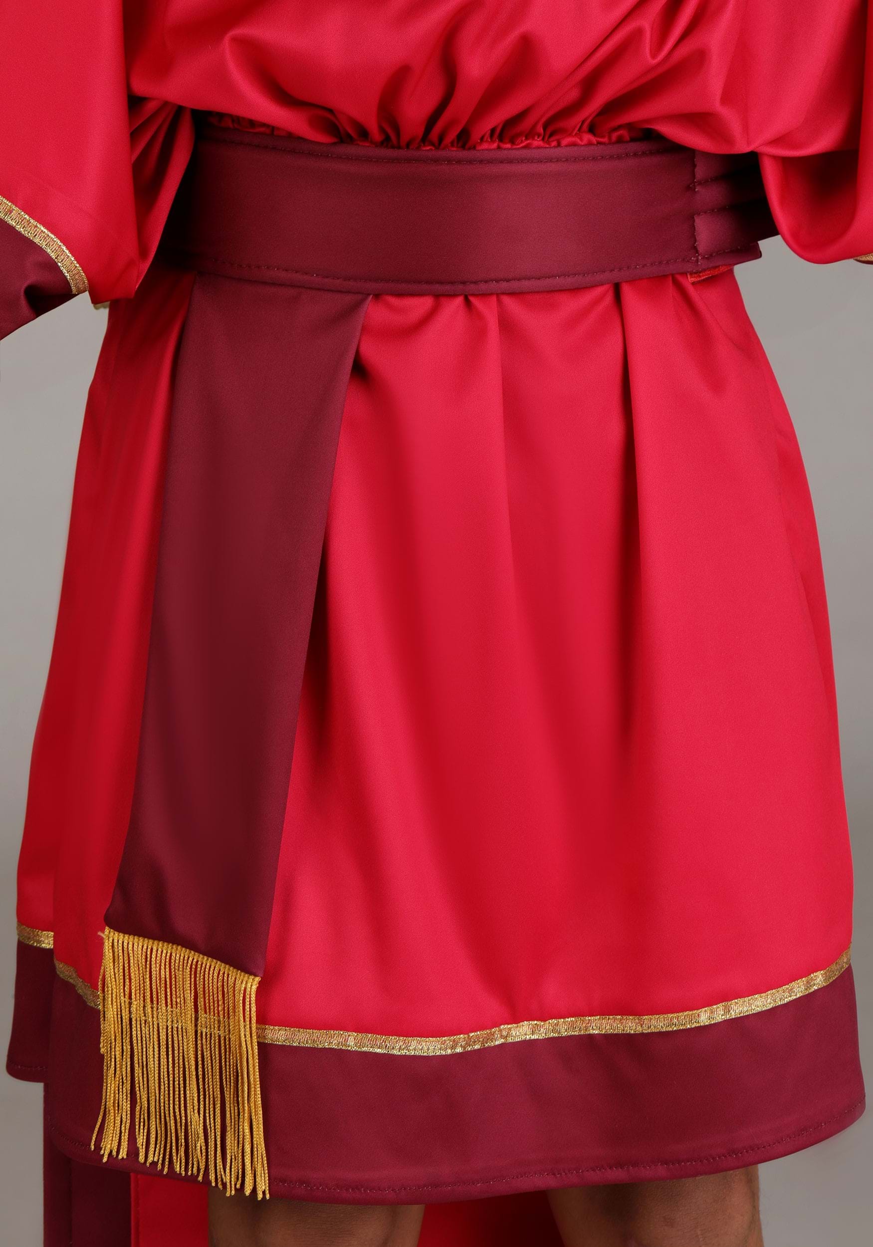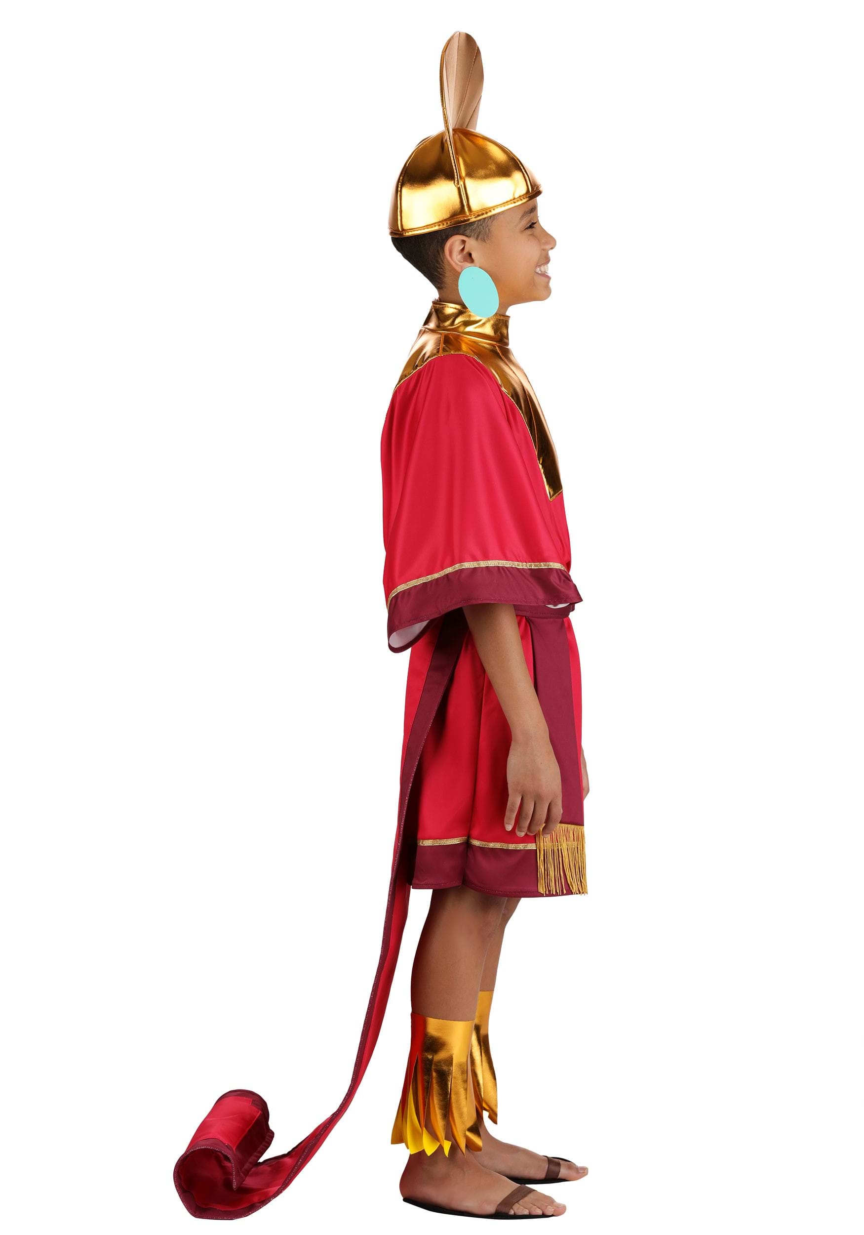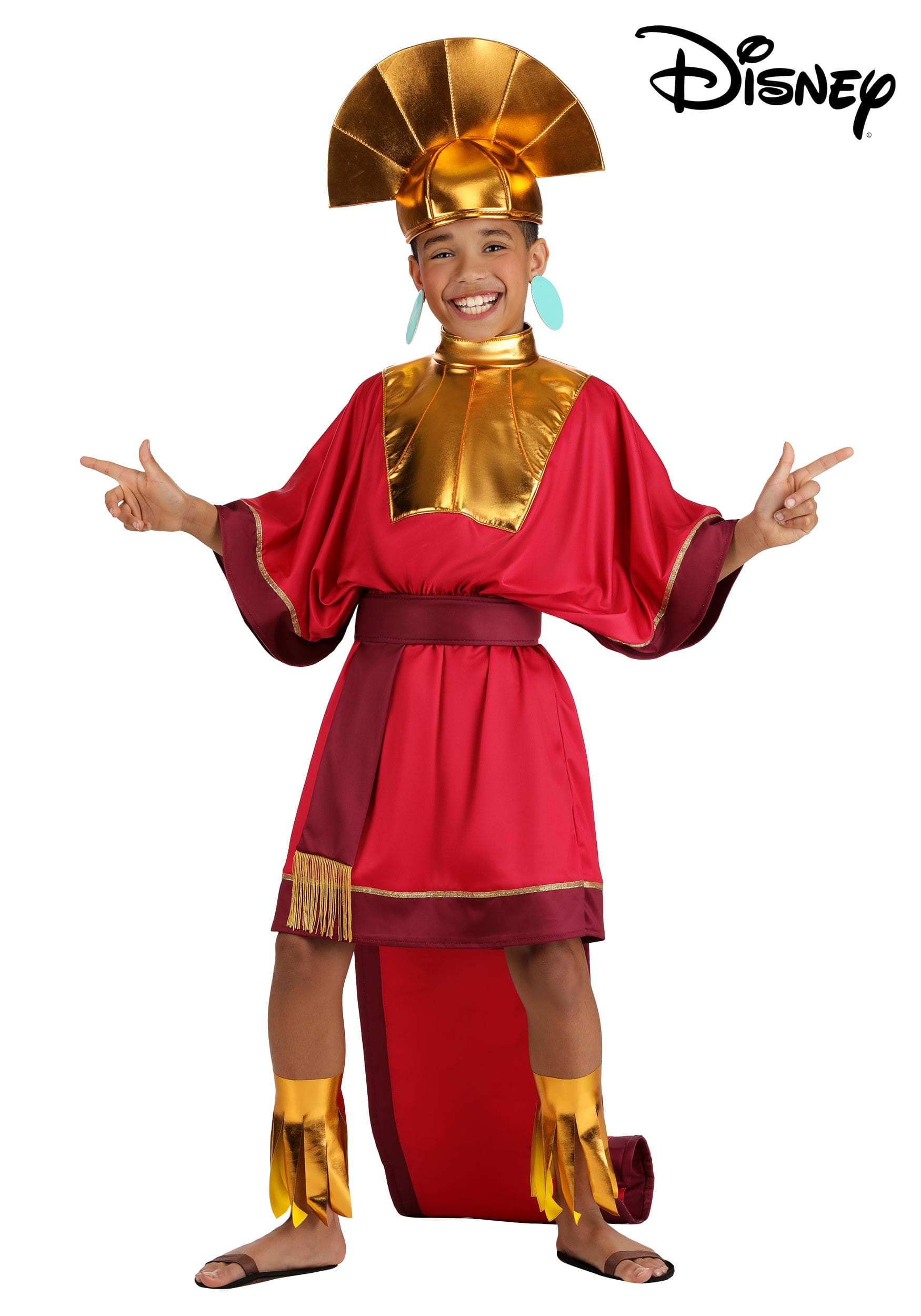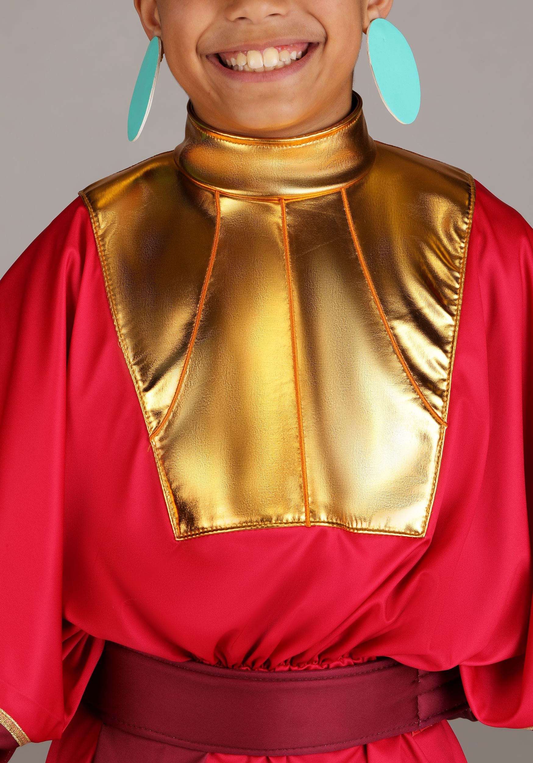 This kid's Kuzco costume starts with a red tunic that features a shiny gold collar and yoke, with a dramatic hanging back panel in the back. A matching belt cinches at the waist while a fan-shaped headpiece and gold fringe ankle cuffs add extra sparkle. Clip-on earrings complete the emperor-worthy look.
