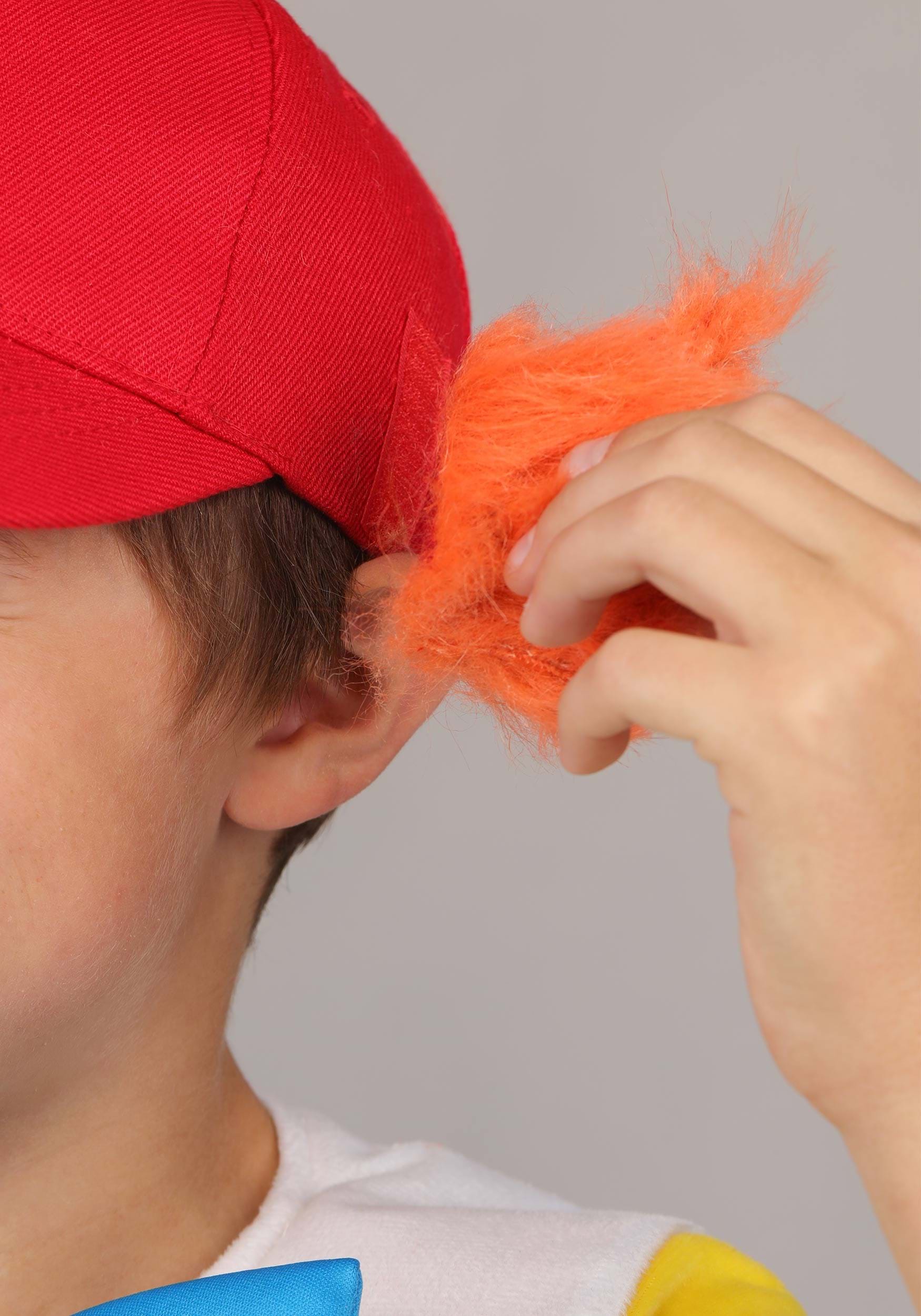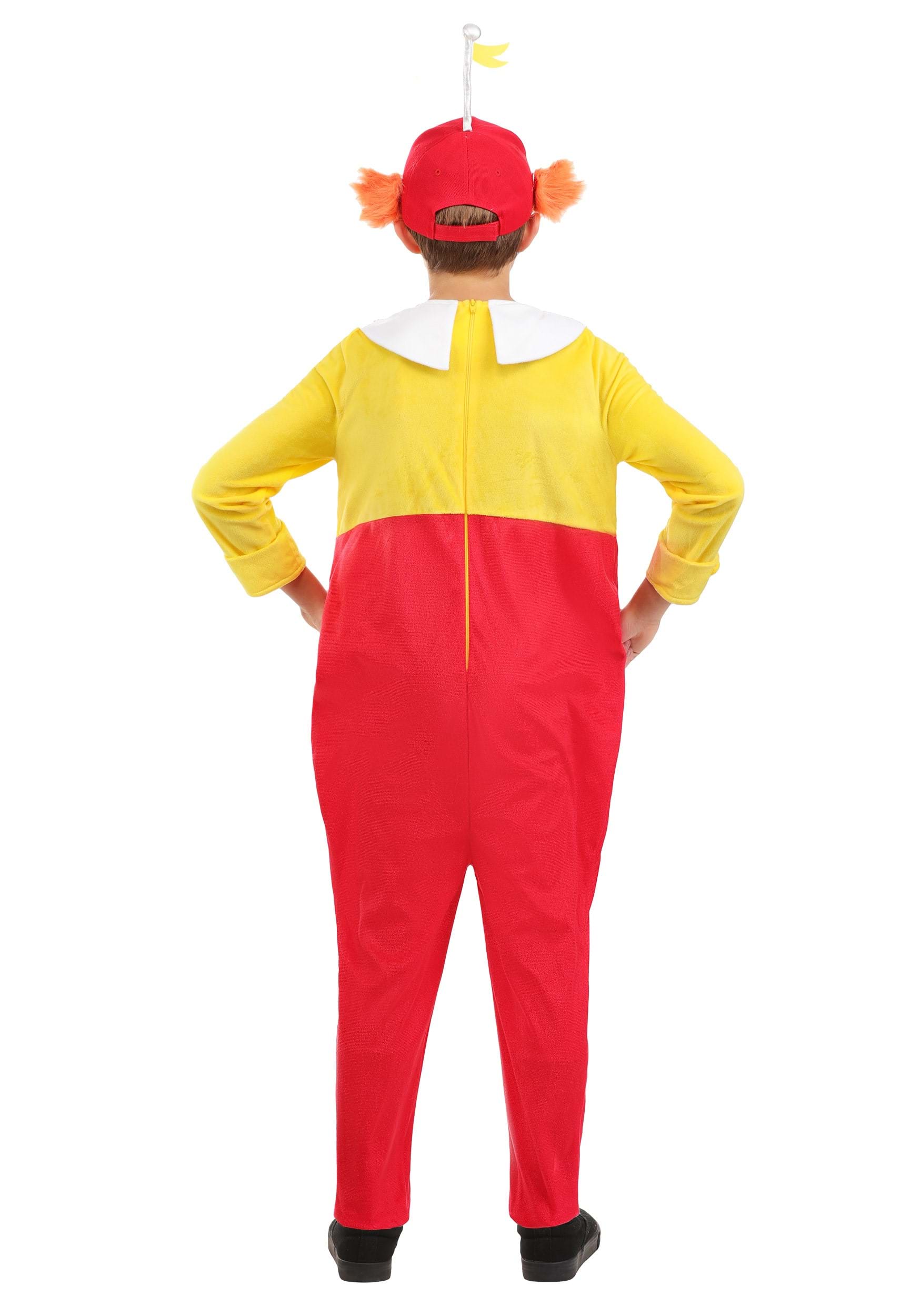 This one-piece jumpsuit makes getting dressed easy. The top half is bright yellow, the bottom half is bold red, and the oversized white collar adds a little extra animated flair. Right in the center sits a big, light blue bow. And then there's the hat. The red baseball-style cap comes with faux red hair on the sides and a tiny yellow flag on top for that perfectly silly finishing touch.