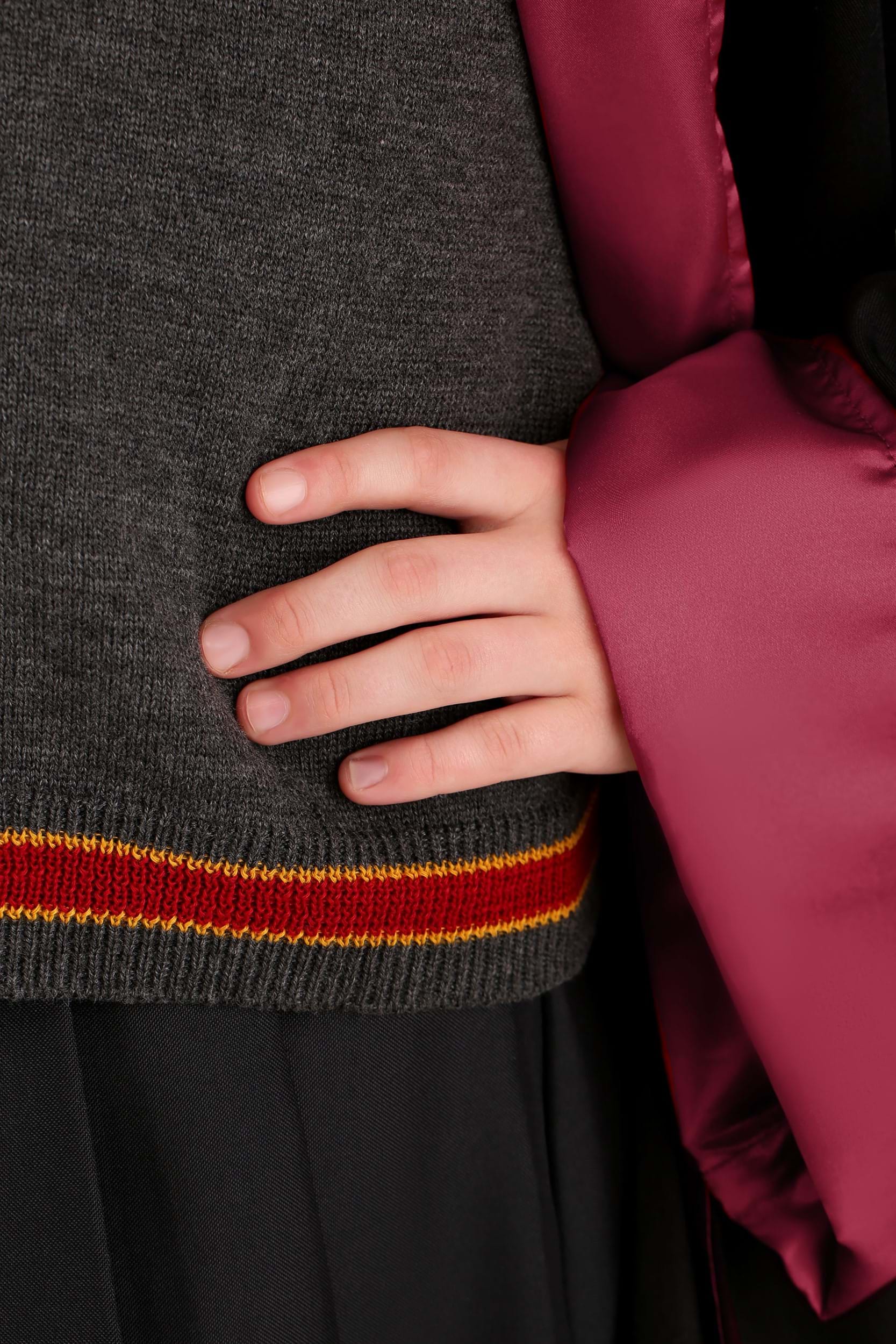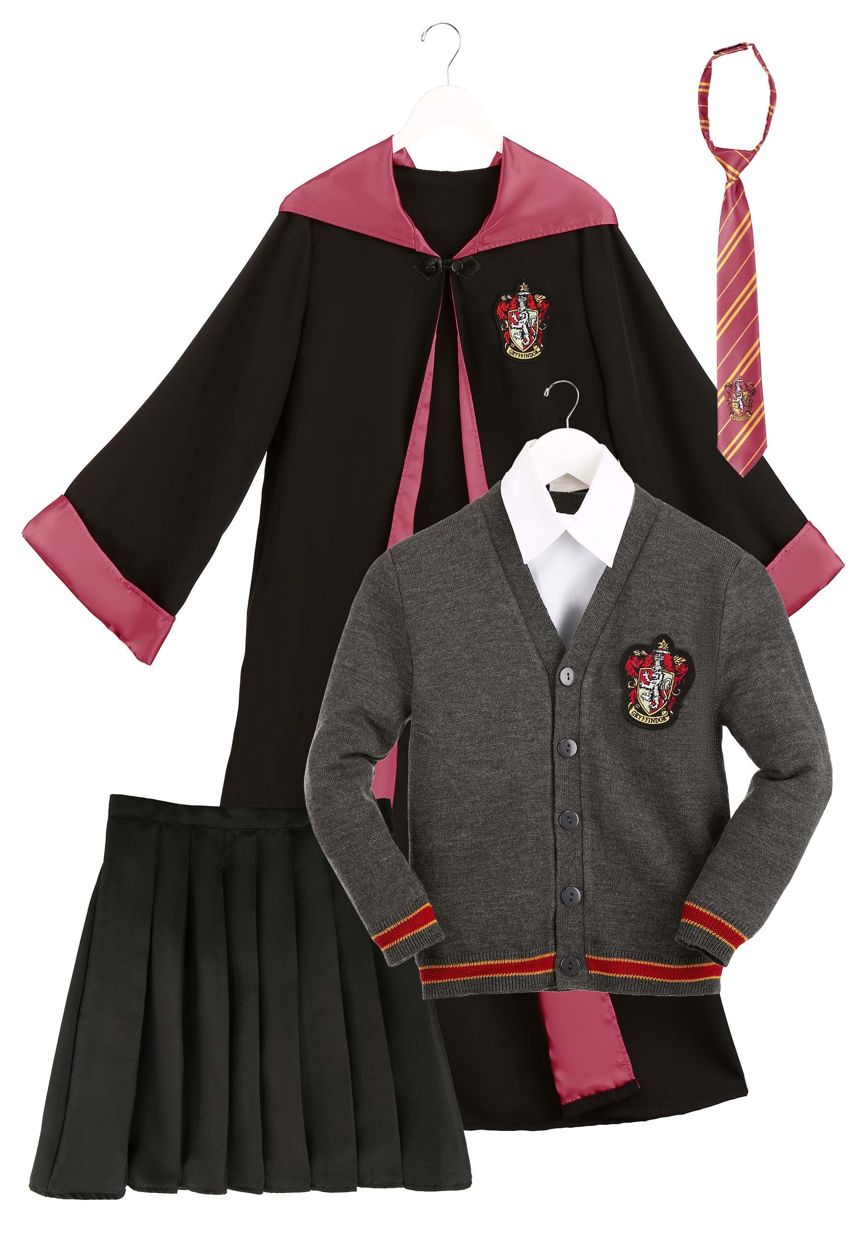 The costume also includes a gray v-neck sweater with a cardigan-style button-up front and a matching Gryffindor crest. A pleated skirt and shirt front recreate the iconic school look, and a satin necktie in gold and burgundy completes the uniform. Just add a wand and an eagerness to correct everyone's pronunciation of Wingardium Leviosa.