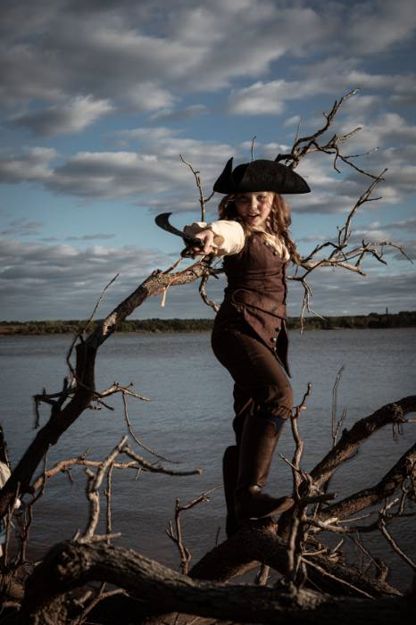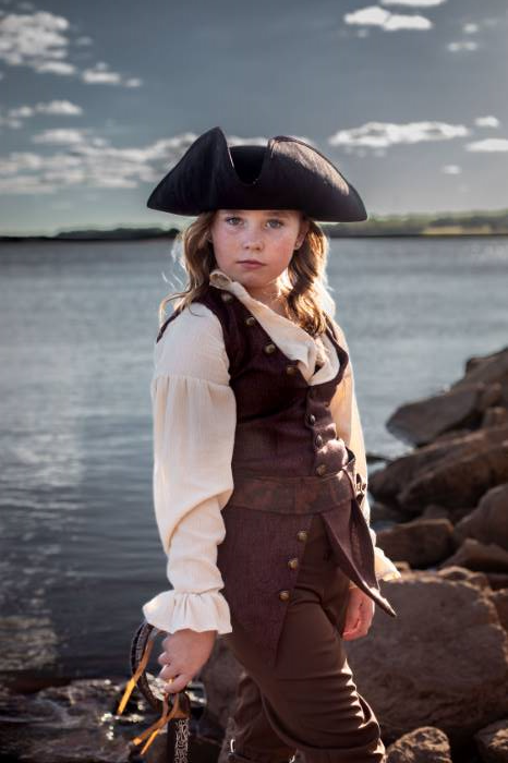 This Made By Us design begins with a beige polycotton shirt featuring an elegant collar and elastic cuffs, perfectly complemented by a woven brown vest adorned with faux buttons. The matching pants have an elastic waistband and faux button accents for easy pirate charm. Accessories like a size-adjustable faux leather belt, boot covers with elastic straps, and a one-size-fits-most tricorn hat complete this dramatic look.