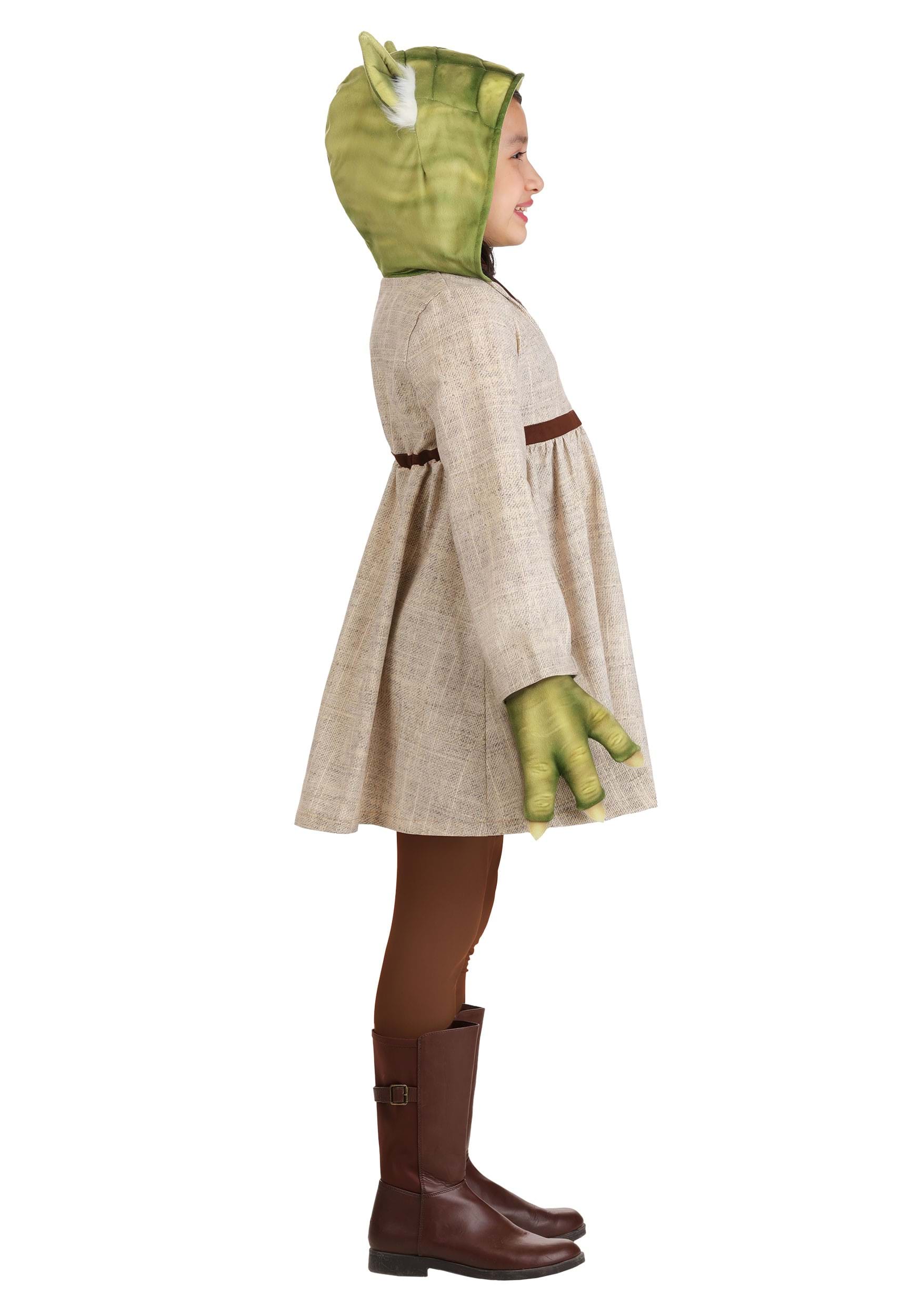 The dress features a softened linen-look fabric printed in Yoda's iconic Jedi robes, with a faux wrap front, a bow-tied waist, and rolled tack cuffs for added detail. The attached Minky hood is fully lined and topped with foam ears, stitched "wrinkles," and fuzzy tufts of plush fur that capture Master Yoda's one-of-a-kind look.