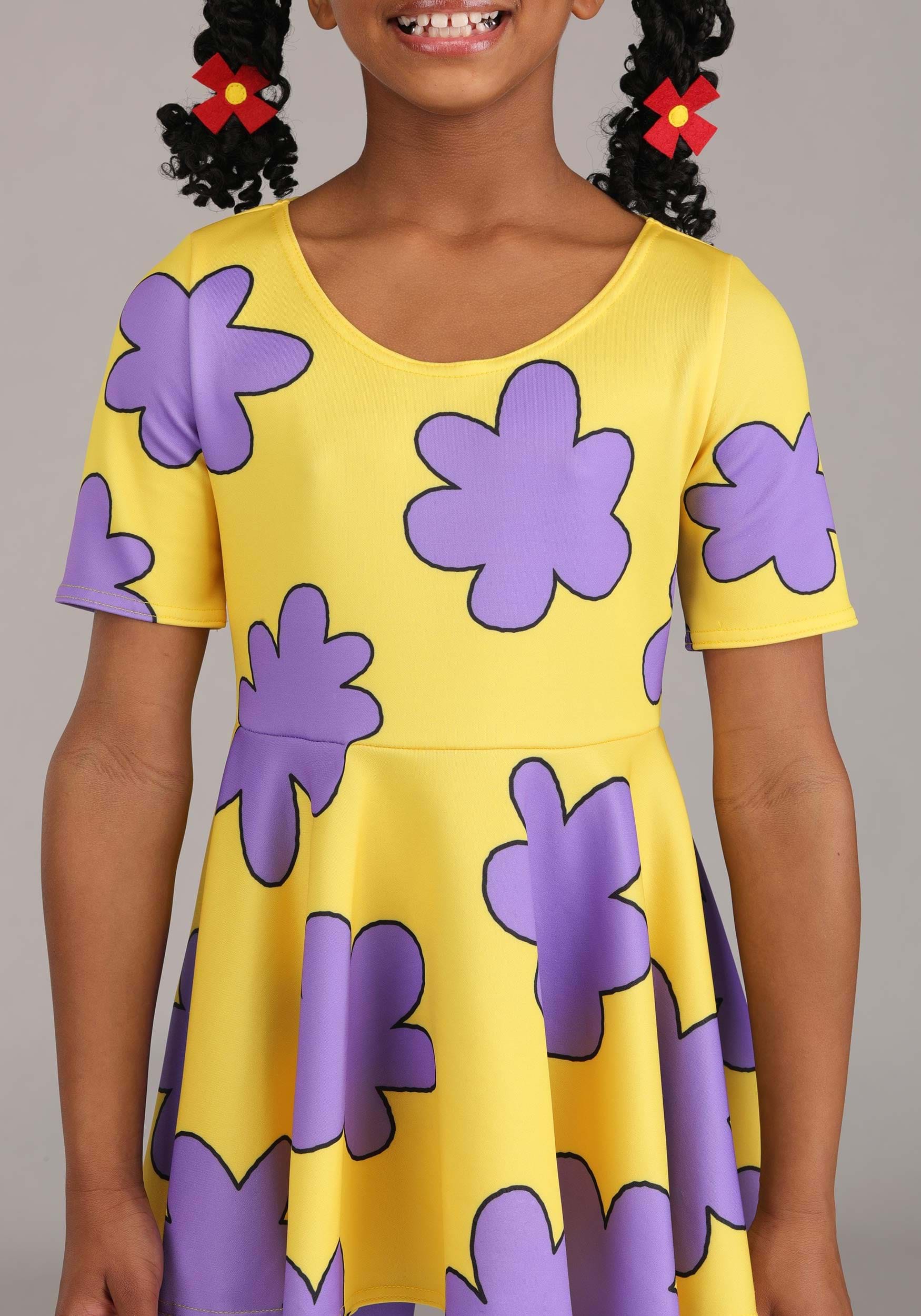 The costume includes a bright yellow dress made from scuba-knit fabric, printed with big purple flowers just like the cartoon. It’s lightweight but structured enough to keep its shape, with short sleeves and a swishy skirt that moves easily during trick-or-treating, class parties, or living room performances.