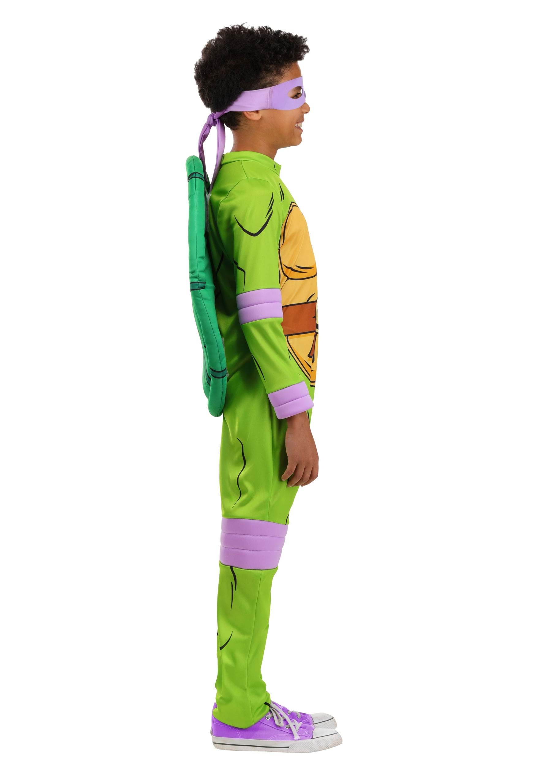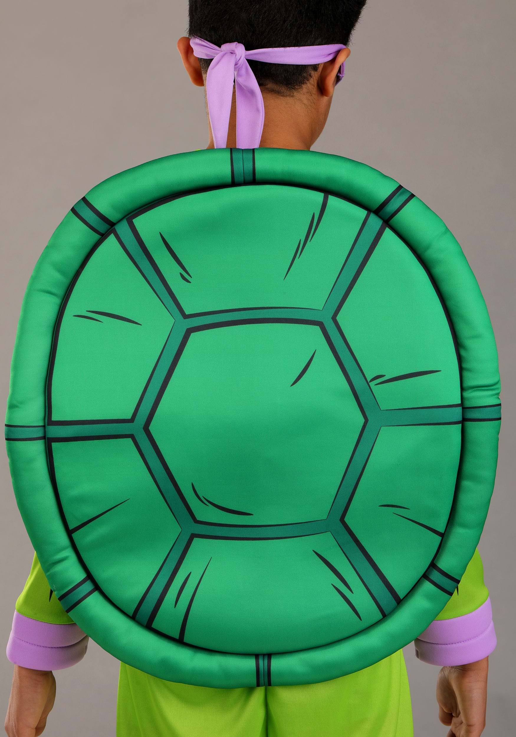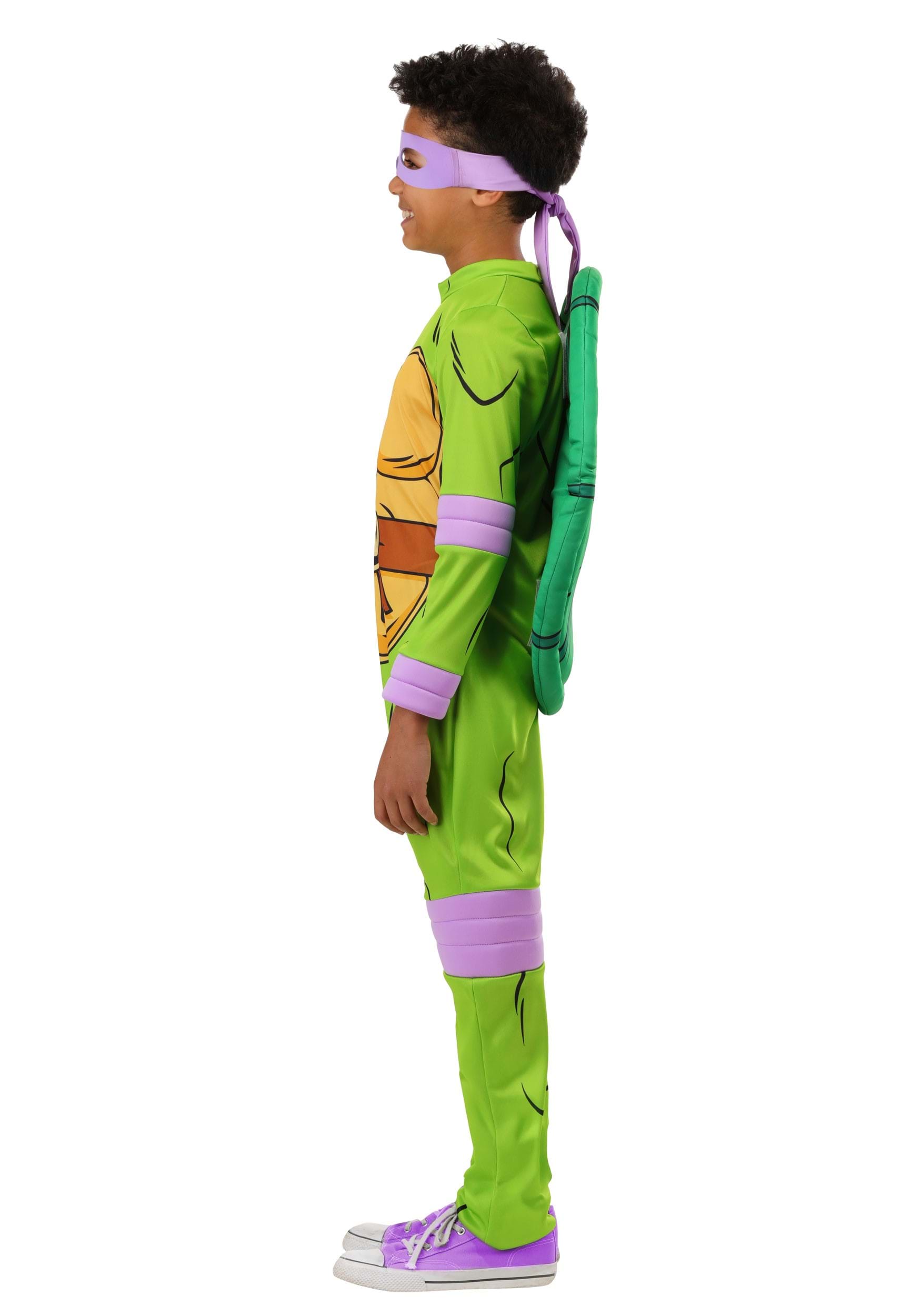 This officially licensed costume includes a full jumpsuit, foam-backed mask, and detachable turtle shell—everything your little ninja needs to transform into the team’s tech whiz. The front of the suit has printed muscle and shell details, plus Donnie’s signature “D” belt emblem, so there’s no mistaking which Turtle they’re repping. Built-in purple elbow pads, wrist wraps, and knee pads give it that authentic cartoon look without needing extra accessories.