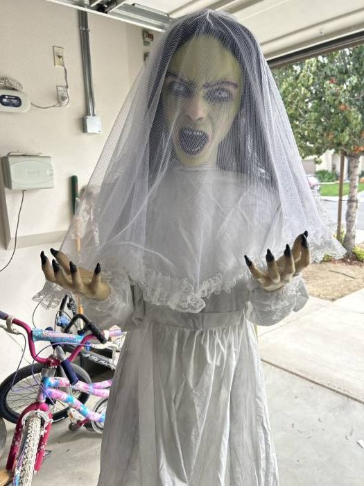 But the real show begins when she comes to life! Animating upon detecting any would-be suitors nearby, her glowing eyes give ghostly blue meets bridal bloodshot as she lures you in with bittersweet promises of being "together forever." The vow takes a sharp turn as she lunges forward and her hands cast an eerie blue backlight on her terrifying face. Motion-activated for maximum surprise, she guarantees that no one makes it down the aisle unscathed.
