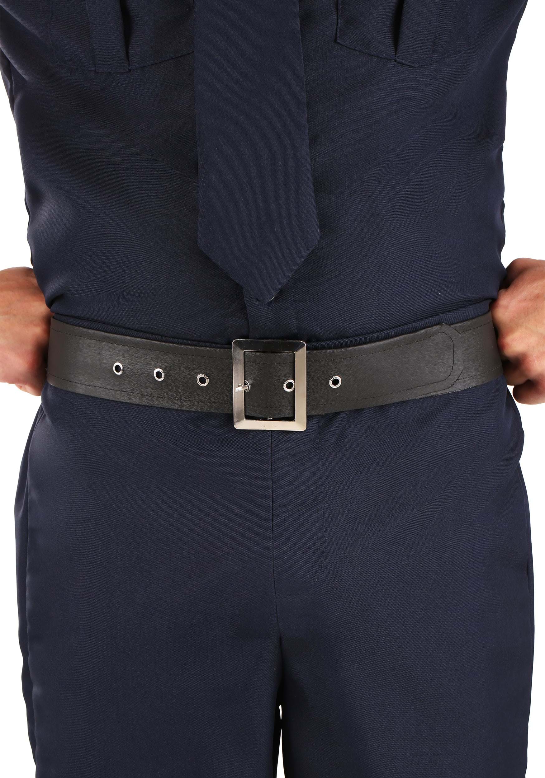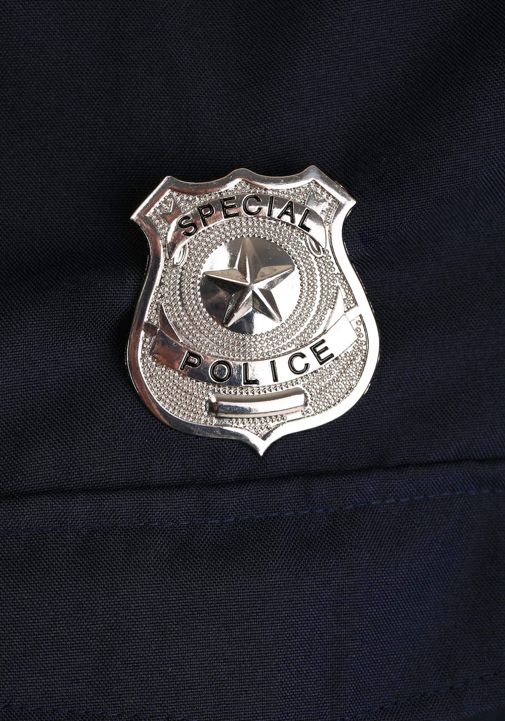 This is one of our Made by Us exclusives! That means it was created by our expert costume designers to capture the look of a real police officer uniform. The costume starts with a button-up shirt that has button-style cuffs, along with buttoned shoulder straps. It also has an embroidered police badge on the sleeve. The matching pants have an elastic band around the waist and also has a false fly front to give it a highly realistic appearance. The black, faux leather belt is fully adjustable with a metal buckle in front. The navy blue tie is a real tie, so you'd better start practicing your Windsor knot! Finally, the hat brings the whole look together with a faux leather brim. The costume also comes with 2 badges that you can pin onto the shirt and the hat.
