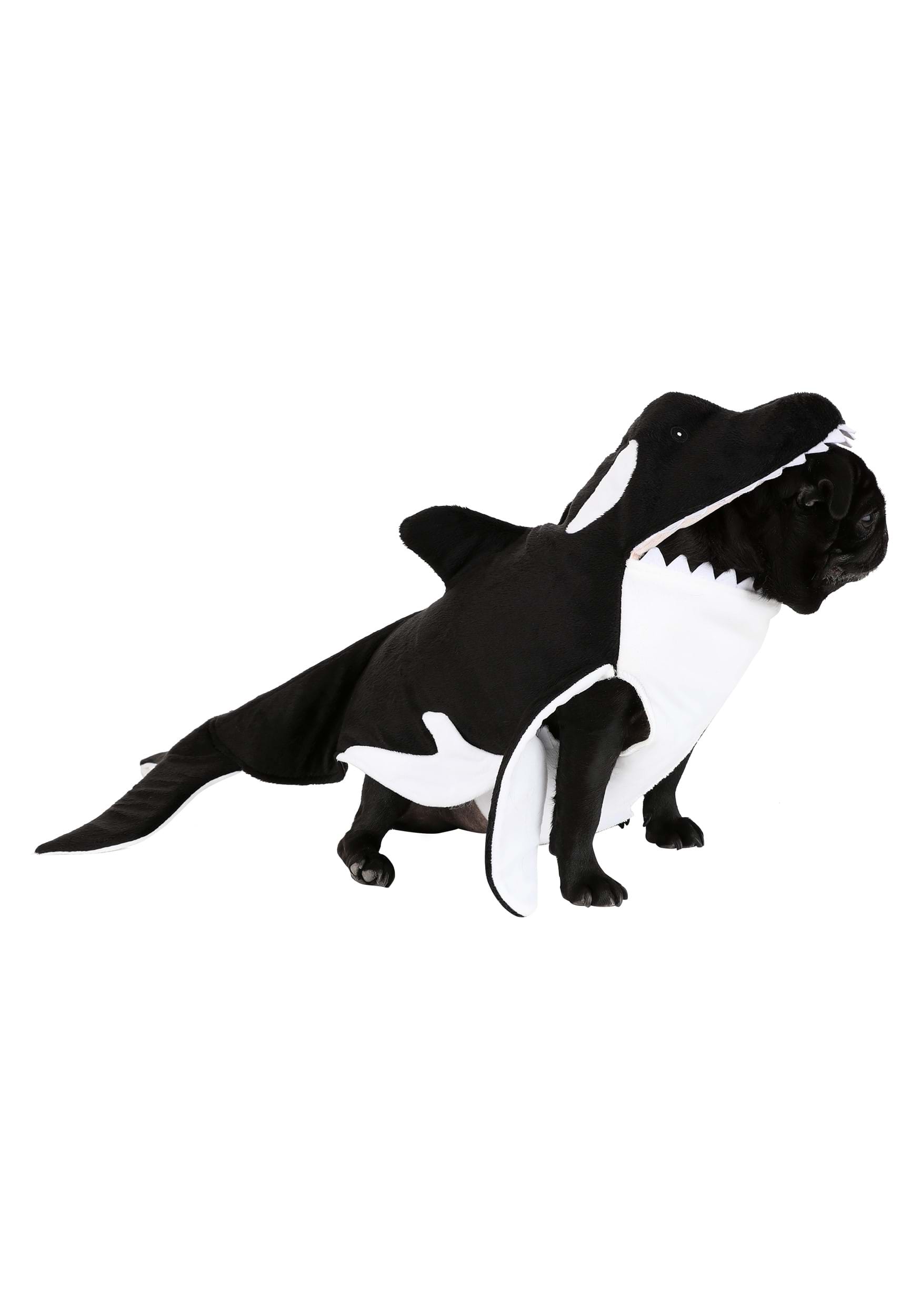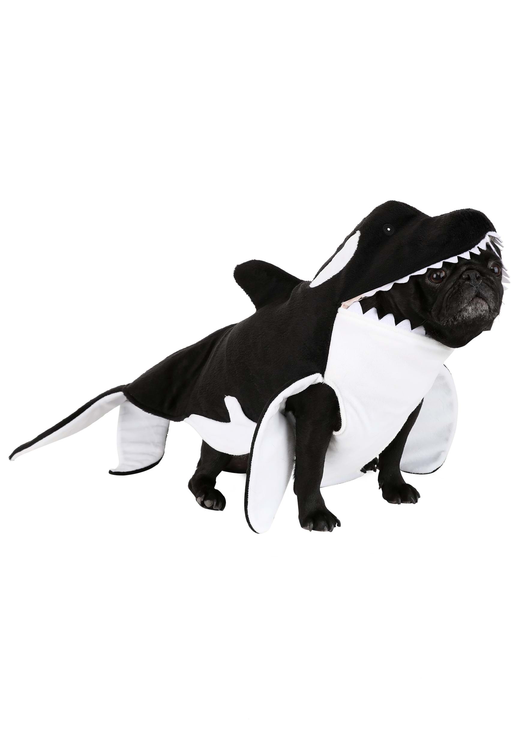 Your fur baby will be the cutest sea creature on four legs in this exclusive Orca Dog Costume! The soft fabric outfit fastens at your pup's neck and under his tummy. The black back has a tiny, stand-up dorsal fin and a black tail. A soft fabric fin is sewn above the two front leg holes. The underbelly of the costume is white, just like a real orca's. The attached hood has embroidered eyes as well as a row of felt teeth, and your pup looks out through the orca's mouth.