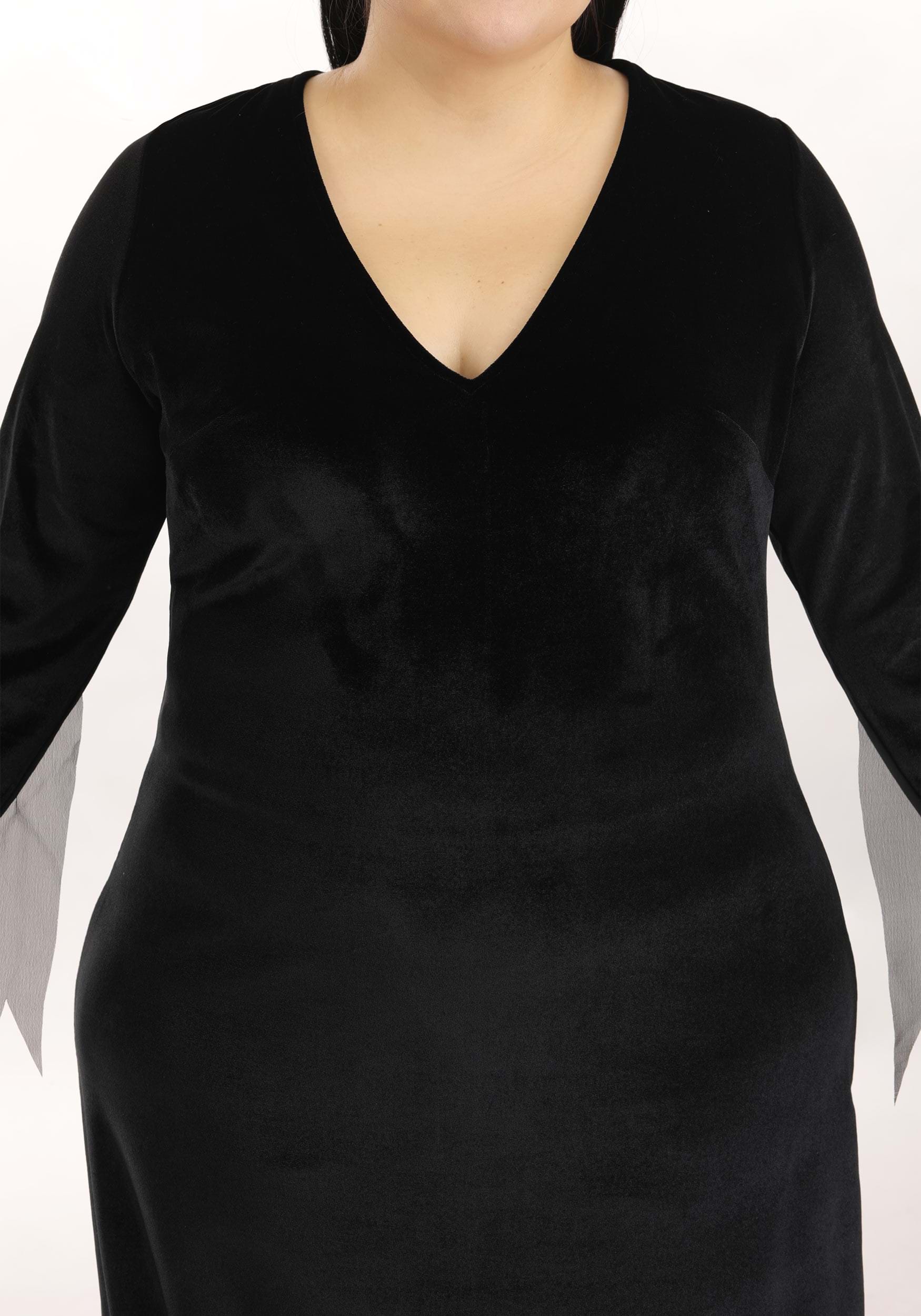 - Stretch velvet, pullover dress, sheer chiffon sleeve draping