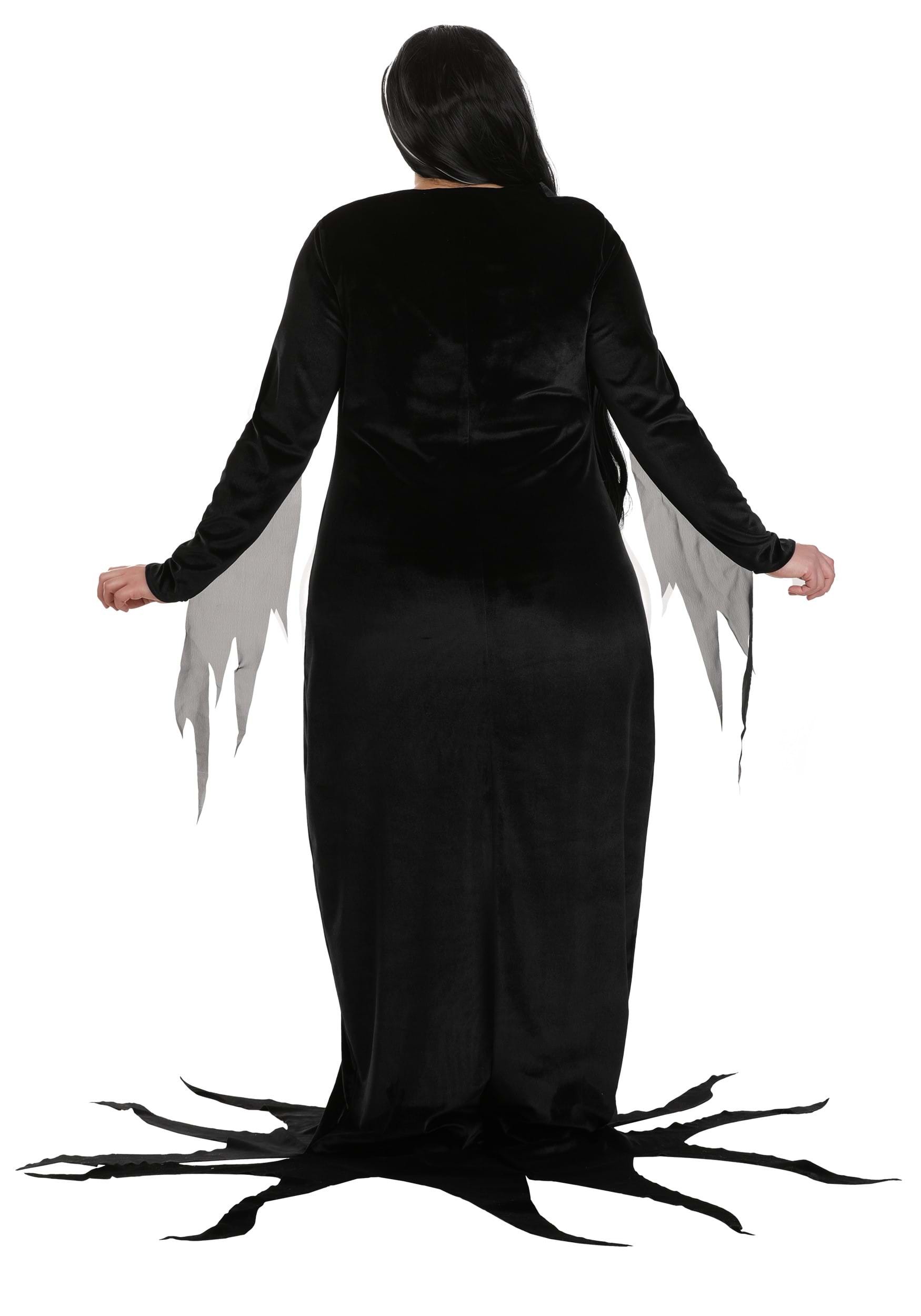 Long sleeves end in flowing chiffon details that trail behind like a gothic whisper. They move with every gesture, adding an extra dose of theatrical melancholy to your already magnetic presence. The look is faithful to the 1960s version of the character, with all the mood and mystery that made her an icon—minus the need to raise your own family of creeps.