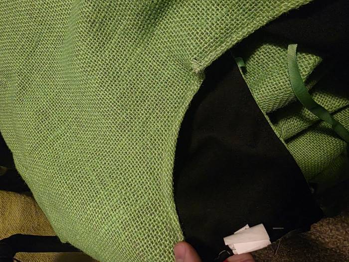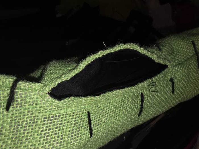 - Burlap mask is foam backed, mesh eyes and mouth, chin rest inside of the mask so as you open your mouth the mask mouth will move, elastic band to secure on your head