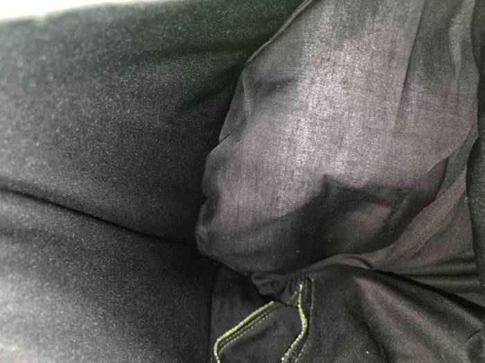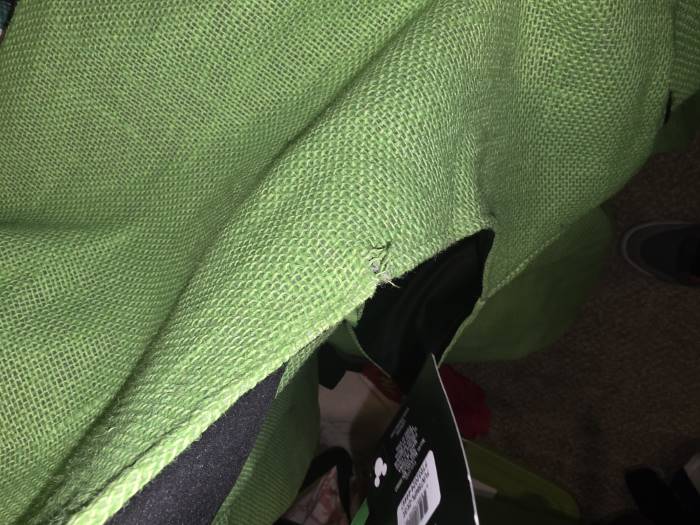 - Burlap and foam jumpsuit has jersey knit lining, black yarn stitching along seams