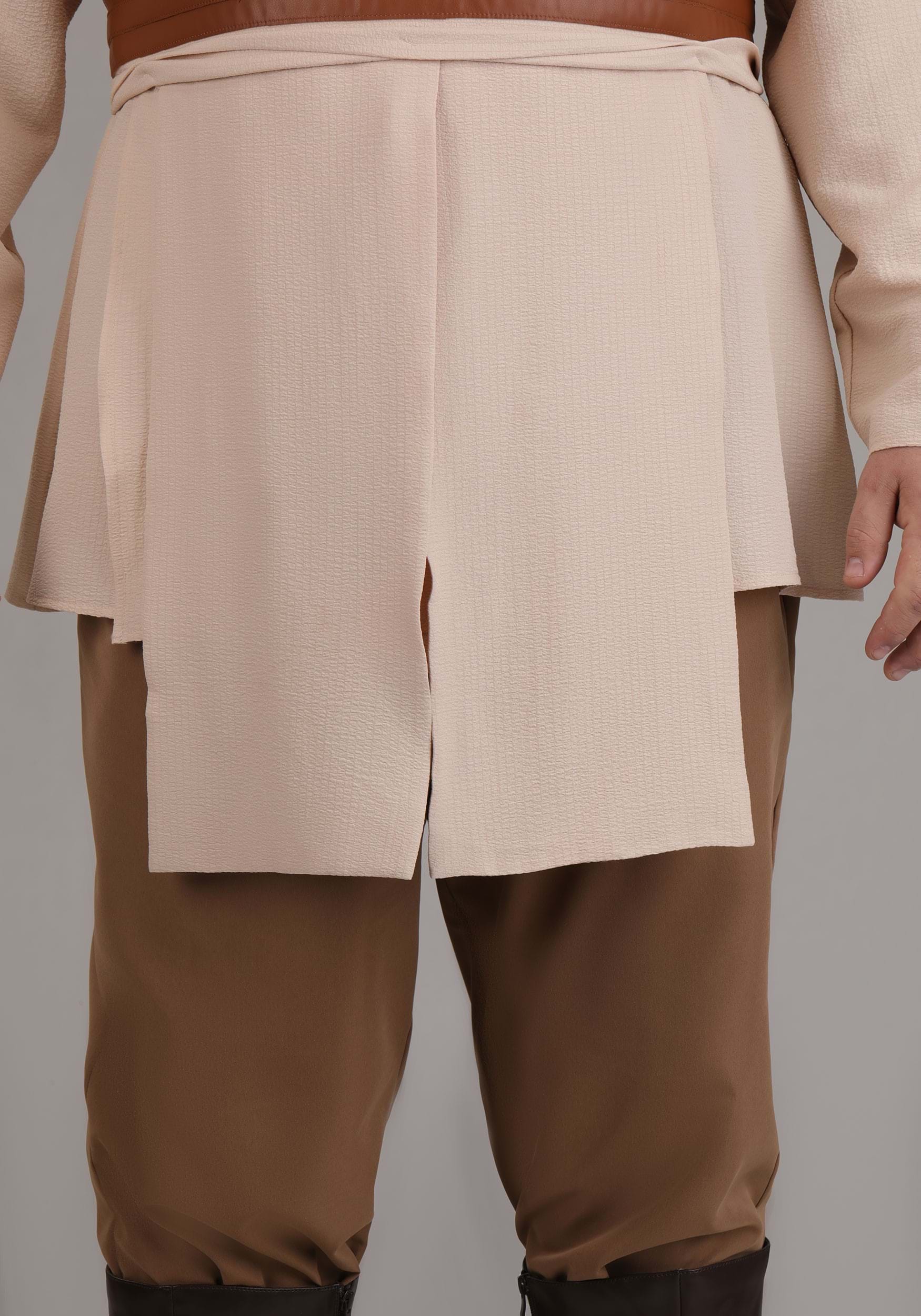 The costume starts with a robe-style tunic made from soft, opaque gauze that flows comfortably while giving off that well-traveled Jedi aesthetic. Woven shoulder overlays are sewn into place to create that layered Jedi robe effect without the need for constant adjusting. Secured inside with simple ties, the tunic stays put. A matching dickie fills in the neckline with the look of a Jedi's classic inner shirt.
