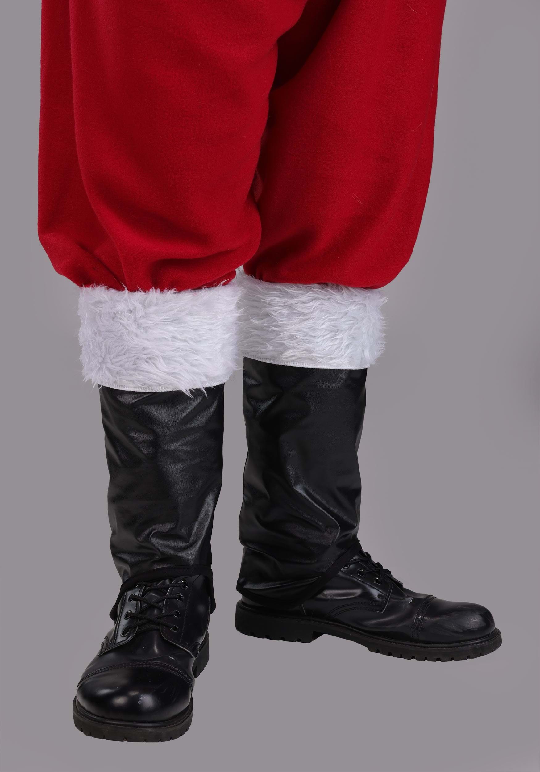 The black faux leather belt fastens in front with a shiny metal buckle, adding structure to the outfit and keeping the holiday belly in check. Black boot tops slip easily over your own shoes for that chimney-ready look, and white gloves finish the ensemble so you can wave regally to the elves—or just keep your hands warm while holding cocoa.