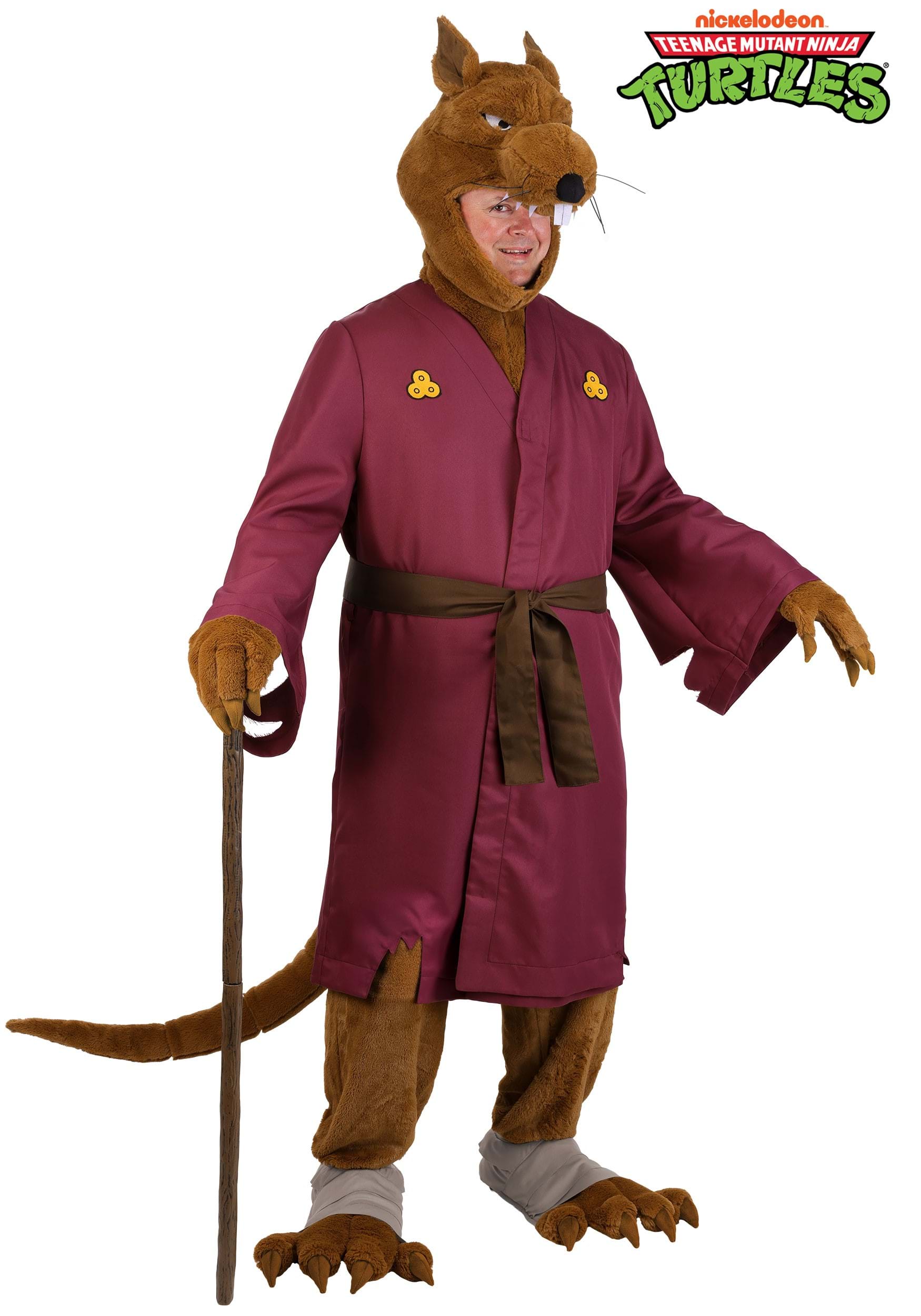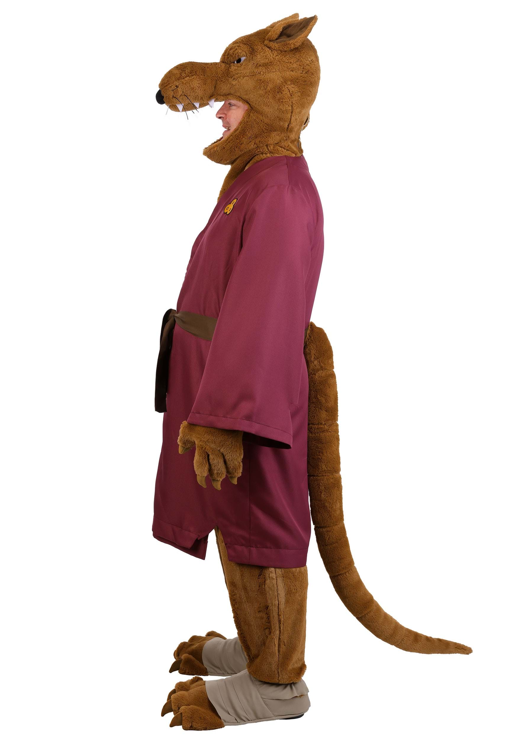The maroon robe is made of sturdy polyester twill and features gold-printed emblems inspired by the animated series. It has a loose, easy fit and pairs with a soft fabric belt that ties around the waist. The faux fur pants fit with an elastic waistband and coordinate with the matching gloves and foot covers, giving you that wise-old-rat-from-the-sewers silhouette.