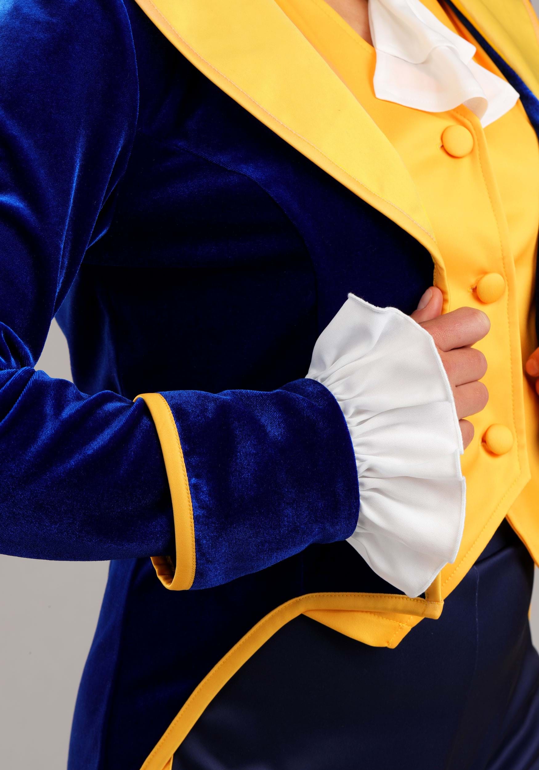 This costume starts with tapered navy pants featuring a golden yellow pant stripe and elastic waist for a comfortably snug fit. A coordinating vest with functional front buttons and a hook-and-loop fastened jabot with a faux gem brooch layer under a blue velvet and gold satin jacket featuring long tails. Meanwhile, a headband with soft-sculpted ears and fiber-filled horns give the costume essential Beast features and a blue velvet hairbow adds a final bit of polish.