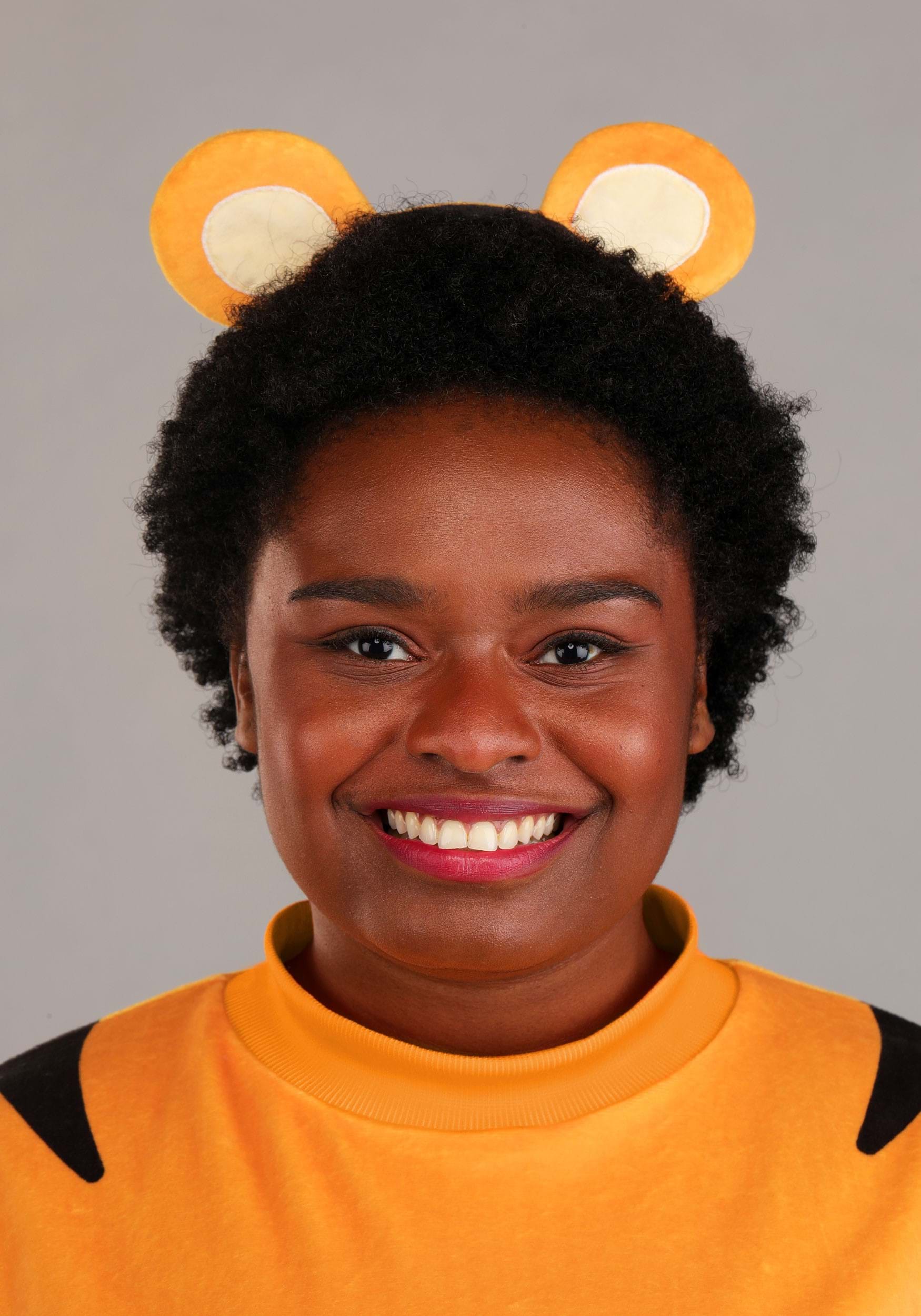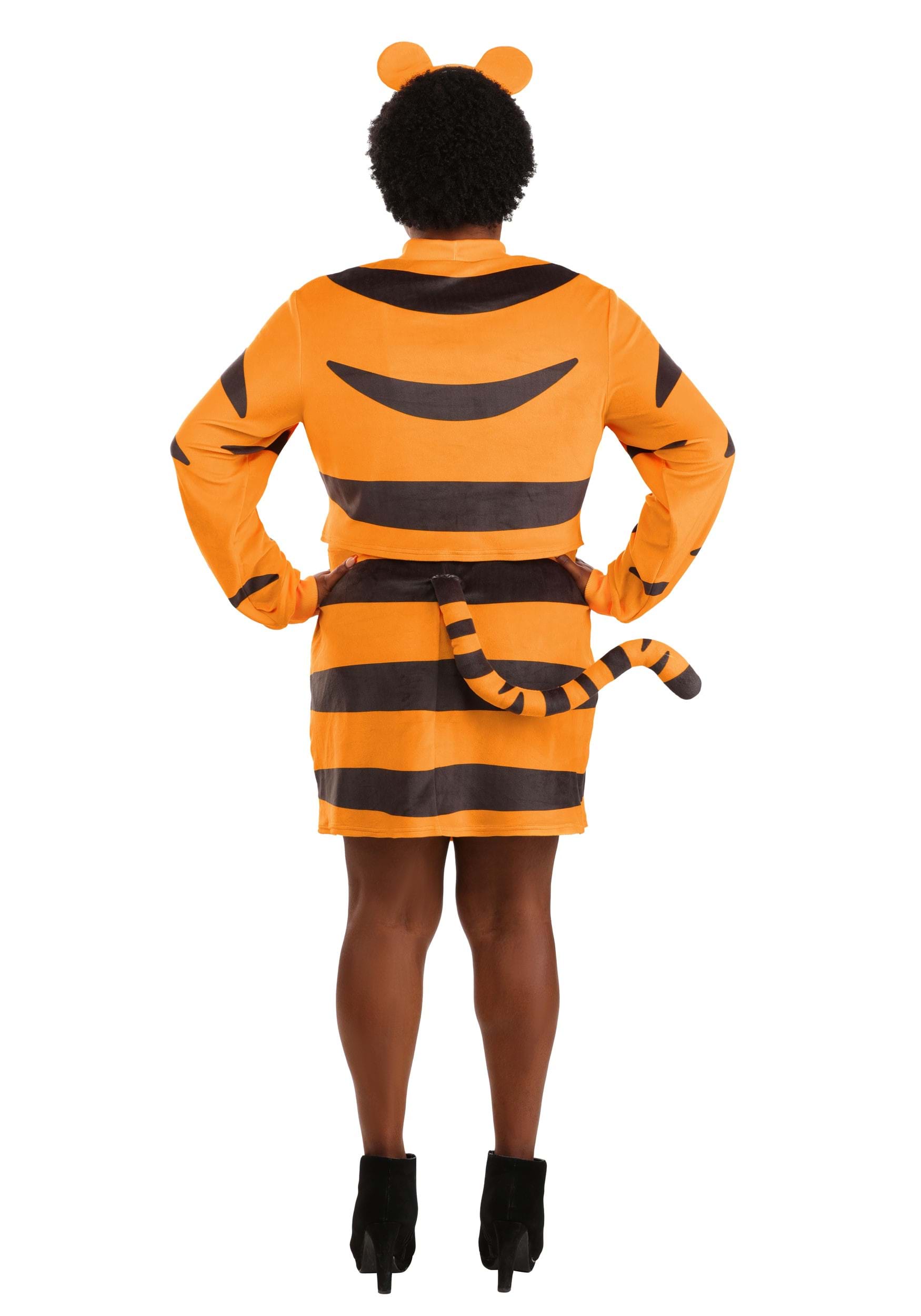 A super-soft fleece long-sleeve and coordinating thigh-length skirt set the base of this stylish Tigger women's costume. The shirt and skirt both feature stretchy materials for a comfortably snug fit, held secure with rib-knit cuffs and an elastic waistband. The outfit is finished with printed tiger stripes, an attached fiber-filled tail with flexible wiring, and a fleece-wrapped Tigger ear headband.