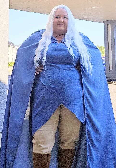 Rise and become the Dragon Queen in this exclusive costume. This Made by Us look was crafted in-house by a team of designers that knows just how brave a queen can be! This ensemble includes a blue dress that zips up the back and pairs perfectly with the buttoned traveler's pants. The long cape has a metal latch and a massive hood. Who needs a coronation when you can crown yourself with this lovely wayfarer's look?