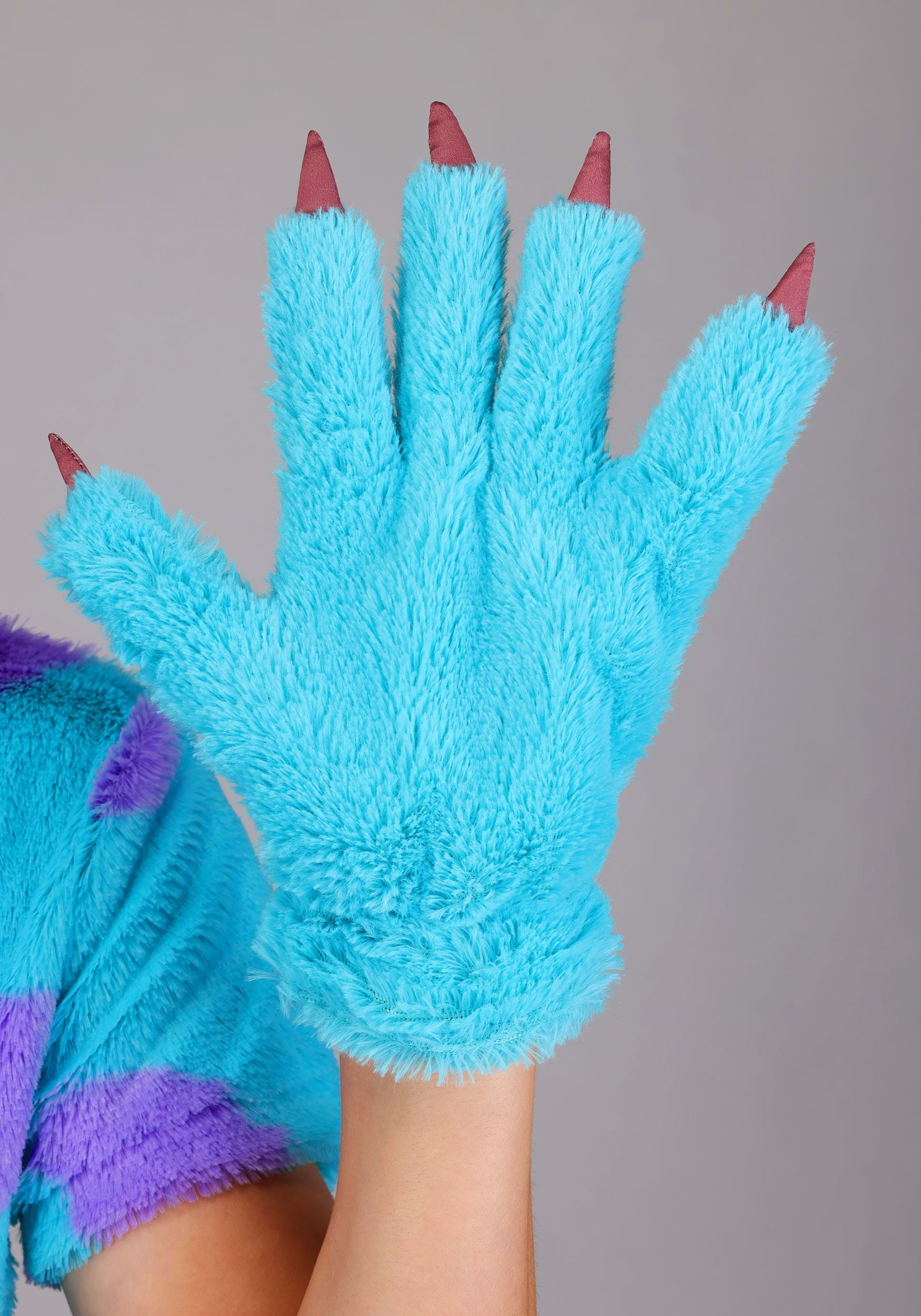 This stretchy faux fur top is speckled in Sulley's signature aqua and lavender pattern, complete with shiny satin spikes along the back. The coordinating skirt features a comfy elastic waistband and a plush tail. A fabric-covered headband holds puffy satin horns with detailed embroidery, and matching gloves finish the look with pointed satin claws—ready for high-fives or roars!