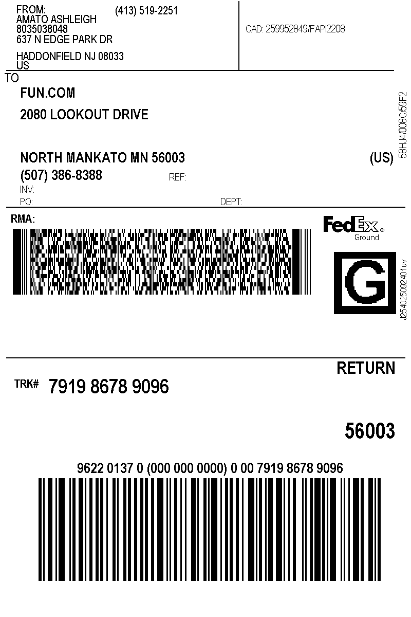 Print Shipping Label and attach to the top of the box.The package can then be taken to any FedEx drop-off location. You can use the FedEx locator to find one near you. You can also take the package to any FedEx driver. Once FedEx has the package, it will take 3 – 5 days for it to be delivered to us.