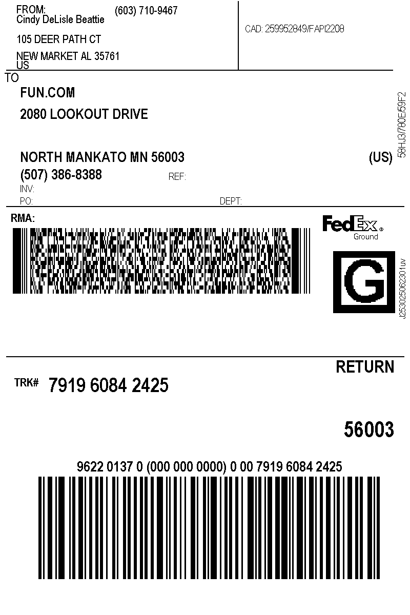 Print Shipping Label and attach to the top of the box.The package can then be taken to any FedEx drop-off location. You can use the FedEx locator to find one near you. You can also take the package to any FedEx driver. Once FedEx has the package, it will take 3 – 5 days for it to be delivered to us.