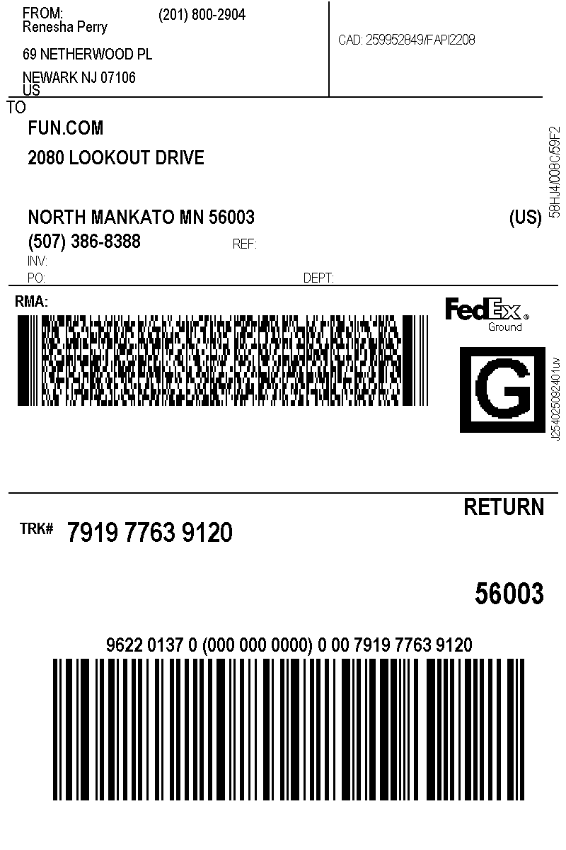 Print Shipping Label and attach to the top of the box.The package can then be taken to any FedEx drop-off location. You can use the FedEx locator to find one near you. You can also take the package to any FedEx driver. Once FedEx has the package, it will take 3 – 5 days for it to be delivered to us.