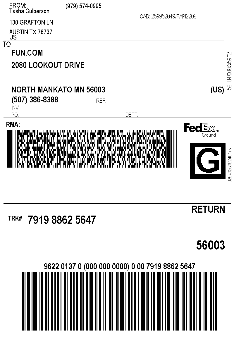 The package can then be taken to any FedEx drop-off location. You can use the FedEx locator to find one near you. You can also take the package to any FedEx driver. Once FedEx has the package, it will take 3 – 5 days for it to be delivered to us.