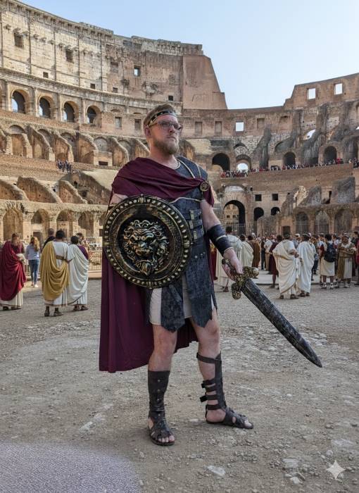 After all, the great audiences of Rome wanted to see mighty warriors locked into intense competition! These powerful fighters took on not only each other in the ring but lions, tigers, even bears! We know what you're thinking, "oh my!" (You were waiting for that, weren't you?) "I could never be one of those fearsome brawlers!" Well, we're here to say that you absolutely can...look exactly like one of those battling warriors!