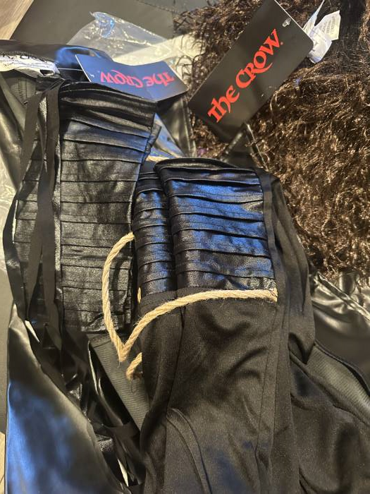 This Made By Us design was inspired by the classic look of Brandon Lee's portrayal of Eric Draven. The ensemble starts with a pullover shirt designed to look like it has seen better days. Featuring structured holes and a sewn-on shiny waist cincher—complete with attached cords—the shirt is then augmented by the long black jacket and matching vinyl gauntlets and hand wraps.