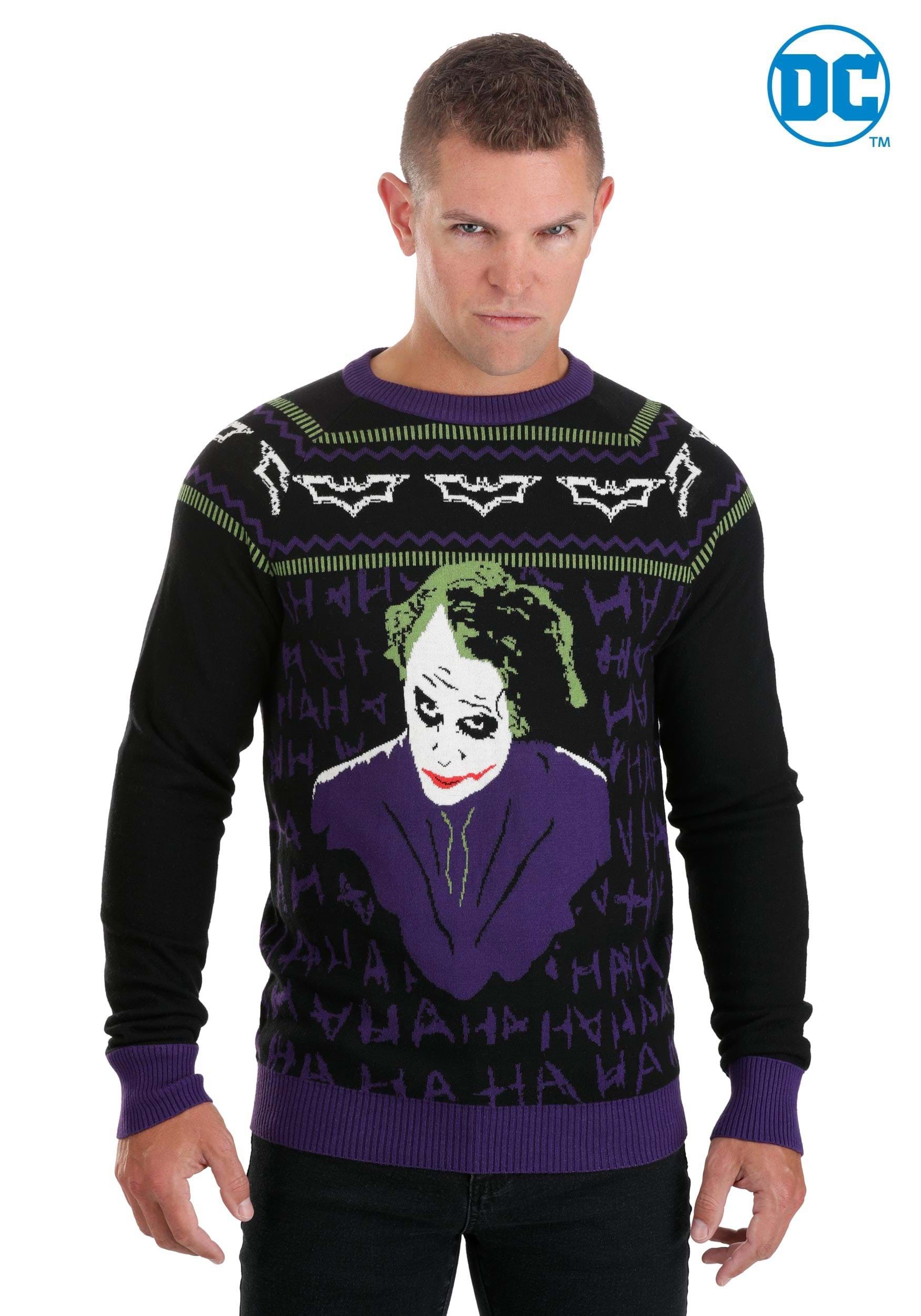 If Christmas jeer is more your style than Christmas cheer, you might like this Joker Dark Knight Ugly Christmas Sweater for Adults! This sweater was Made By Us from a soft acrylic and cotton blend to keep you warm during the winter holidays. It features the Joker on the front along with a motif of Batman’s symbol and a graphic representing the villain’s crazy laugh. This holiday season, be your own kind of festive with this cozy sweater!