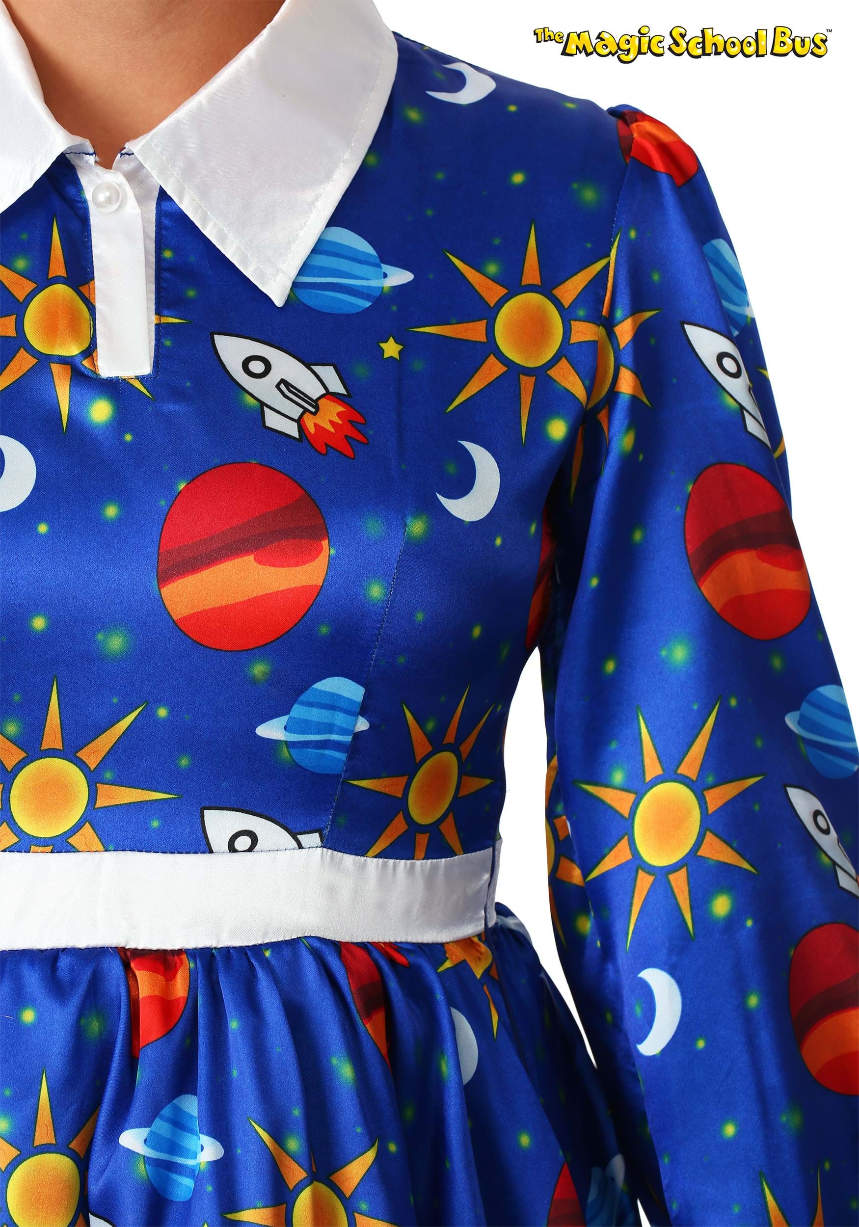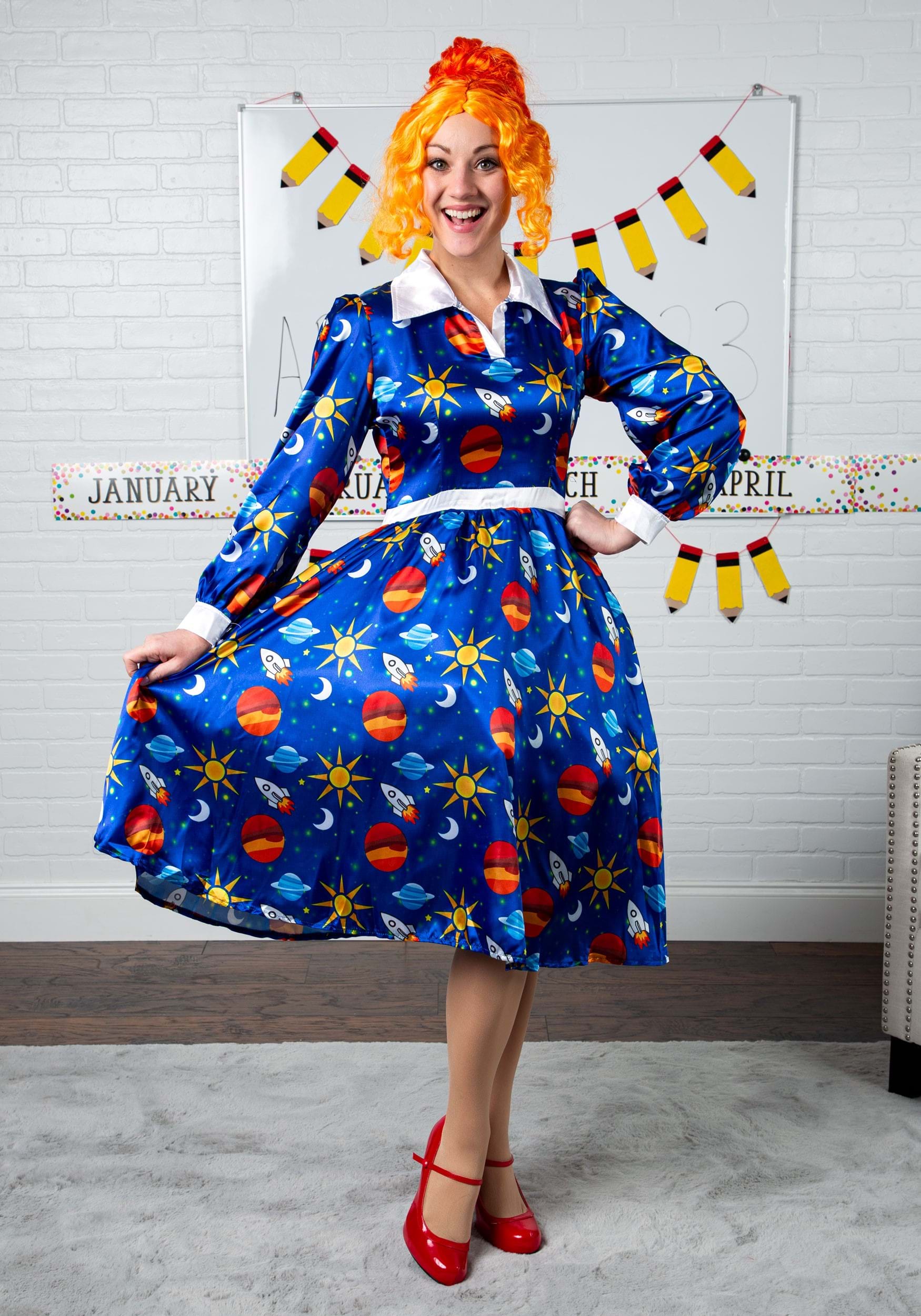 Here at Halloweencostumes.com, we ask the important questions. Like, what's going on with Ms. Frizzle's dress? Is that Jupiter, Saturn, and a rocket ship on there? Did she make it herself? And how do we get our hands on a Magic School Bus like hers?
